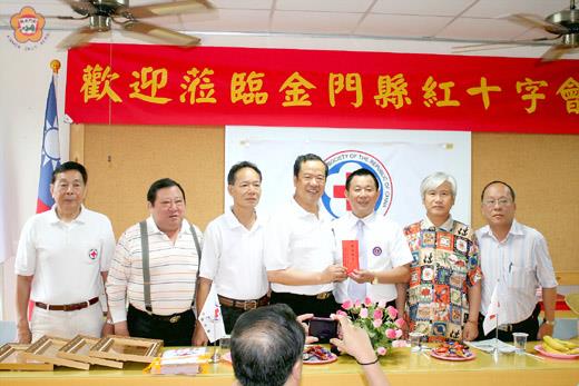 台北市松山慈祐獅子會昨日與新加坡、韓國姊妹會聯袂拜會金門縣紅十字會,並捐贈人道救援經費新台幣二萬元,受到會長王水彰由衷感謝。 抵金進行離島關懷及旅遊的台北市松山慈祐獅子會、大韓民國阿里嵐國際獅子會、新加坡亨德生國際獅子會一行七十五人,是由台北市松山慈祐獅子會會長許銘錠等率隊,於昨日上午九時前往莒光山莊的金門縣紅十字會拜會、參訪交流,受到會長王水彰、常務監事王世瑞、理事林再求、顧問彭火興、總幹事陳忠飛等歡迎。 王水彰也代表金門縣紅十字會歡迎國際善心人士蒞金指導,對於大家對人道救援和社會服務的支持、贊助,並以金門處在兩岸重要交流往來要道,紅十字會扮演人道救援重要角色,將本持「人道、博愛、救援」精神,把紅十字會事業做到最好。 許銘錠等人也希望藉拋磚引玉的贊助社會服務,讓需要關懷者得到更大關懷。 而金門縣紅十字會顧問彭火興,也慨捐新台幣一萬元,來贊助紅十字會的人道救援經費。