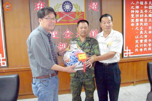 端節將屆,金城鎮長石兆瑉昨日上午與鎮代會主席陳天成率同金城各界勞軍團,前抵金西守備隊探慰在營子弟,並致贈金酒、飲料,提前向官兵們祝賀佳節快樂,鎮長石兆日對於金西守備隊平日協助地方事務表達由衷謝意,守備隊也以琉璃紀念品回贈,現場洋溢著軍民一家的和諧氣氛。 由金城各界組成端節慰勞團一行二十餘人,由鎮長石兆瑉與鎮代會主席陳天成領軍,成員有鎮民代表張含麗、西門里長李水泉、賢庵里長盧志嶢、金水里長黃國民、金城國中校長楊瑞松、國小校長李仁木、董國正、金城幼稚園園長盧淑惠、軍友社金門連絡組組長盧清土、金城鎮後備軍人輔導中心前主任陳丕陽、婦聯青溪金城支分會主委邱育惠、鎮公所課長等人於昨日上午十時三十分前抵金西守備隊,提前向平日勞苦功高的守備區戰士賀節,受到守備隊副隊長吳為盛、政戰處長王士誠中校及多位縣籍服役子弟熱烈歡迎。 鎮長石兆瑉表示,金城鎮與金西守備隊一直以來保有良好的軍民關係,今年四月十二迎城隍,守備隊也出動七十位弟兄扛蜈蚣座參與遶境活動,平時也經常參與轄區的各項環保活動,協助整頓環境,以及獨居老人照護與送餐服務等,受到民眾的讚許。 此外,金西守備隊經常向鎮公所商借大量折疊椅,石兆瑉允諾將協助購置大批折椅贈送守備隊,協助解決椅子不夠的窘境。他並感謝官兵們戍守前線的辛勞,讓民眾能平安快樂過節,提前祝賀端午佳節快樂。 吳為盛副隊長也感謝石鎮長對駐軍的照顧與支持,並安排縣籍的子弟兵與慰勞團一起閒話家常;軍民雙方並也互贈紀念品,場面十分溫馨。