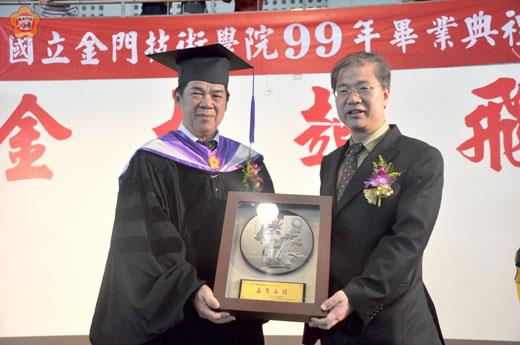 國立金門技術學院最後一次畢業典禮,以溫馨創新的活動,「繼往開來、金大起飛」的典禮主調,歡迎各界來賓、畢業生家長和金門鄉親一同見證金技即將於今年八月一日成功改名為國立金門大學。 畢業活動於昨日下午二時假縣立體育館舉行,這一屆的畢業生有五百五十八位,包括研究生、日間部四技生、進修部二技生與四技生,研究生和進修部畢業生,很多是社會人士在職進修,他們喜悅的身著大學、研究所畢業服、戴著方帽,和年輕的畢業學子打成一片,還有全家人一起來分享畢業活動的喜悅,現場到處都有畢業生把握機會拍照獻花,洋溢一片喜悅祝福與離情依依的溫馨氣氛。 縣長李沃士、議長王再生及各界來賓表達對畢業生的深深祝福。今年金門技術學院開啟了與大陸漳州職業技術學院的研修生交流,福建省漳州職業技術學院副院長何小青特別跨海來參加不一樣的畢業典禮,他也帶來紀念品賀禮,祝賀金技學院八月一日成功改名為金門大學。 何小青也感謝金門縣長李沃士、議長王再生以及金技學院師生照顧該校來金進行學術交流的子弟,期望兩校的交流更加緊密,永固情誼。何小青期許在美好時代裡,畢業生未來成就超越老師,並成為社會進步、經濟繁榮的棟樑人才。 李金振也特別感謝府、會首長和海內外金門鄉親,在該校接受教育部改大評鑑的最重要關鍵時刻,發揮「臨門一腳」的力量,讓該校順利通過評鑑,改大成功。他代表學校師生致贈感謝牌予縣長李沃士、議長王再生。 典禮中,知名詩人鄭愁予講座教授首度發表並朗讀未來「國立金門大學」校歌歌詞,內容營造燕南書院、金技學院與金大的歷史傳承。 李金振也為畢業生們撥穗、頒發畢業證書,恭喜他們完成大學、研究所階段的學業,祝福他們展翅高飛。 李金振也頒獎獎勵績優的畢業生,肯定他們求學的優良表現。 畢業生代表也致謝詞,感謝師長的傳道、授業、解惑,並致贈學校紀念品。 活動中也穿插熱舞,炒熱了現場的氣氛,沖淡了畢業離情的依依。還有元氣康樂的表演和各系、社團端出的才藝節目,要讓畢業的學長和學姊留下難忘的回憶。很多台灣學子的家長也專程來金門參與子女的畢業活動,感受到金技學院學子所展現出的青春和活力。