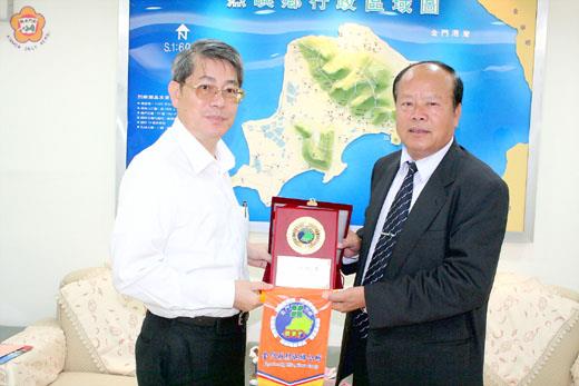 經濟部標準檢驗局局長陳介山抵金視察業務,昨天前往小金了解地方上的需求和建議;烈嶼鄉長洪成發贈烈嶼之友和鄉旗、鄉徽,歡迎陳介山的到訪,並就烈嶼觀光和產業發展,交換意見。 陳介山和標準檢驗局副局長莊淑琴、黃來和,以及高雄分局長張修德等一行人,昨天上午九時許抵烈嶼鄉公所拜訪;陳介山表示,此行主要來視察業務,對於金門地區各項標準檢驗工作,他也給予肯定,認為均做的很好! 在拜會中,洪成發致贈烈嶼之友和鄉旗、鄉徽給陳介山,歡迎他的到訪,洪成發表示,烈嶼以產芋頭出名,為提高產量和芋農所得,明年將推廣芋頭專業區栽培生產,並爭取保價收購,以提高種植意願;甚至配合芋頭加工,增加產值和經濟效益。 洪成發也提到為了節能減碳,未來烈嶼將朝著電動車發展,形成有地方交通發展特色;同時,未來也將規劃渡假村,吸引人潮到烈嶼觀光旅遊,增進烈嶼的觀光事業發展和經濟。標準檢驗局局長陳介山一行,也前往各地參訪,暢遊烈嶼風景名勝,對於烈嶼的好山好水,留下深刻的印象。