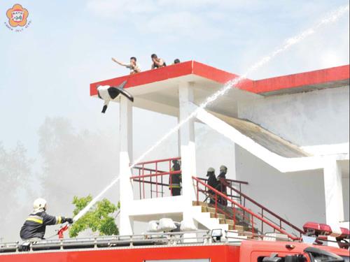 金防部主辦的災害救援演練中,「災民」大喊:「我受不了啦!」接著就有一個身影跳樓,嚇了大家一跳-原來是一個道具! 金防部在太湖營區的災害演練分為道路障礙排除演練和災害救援演練。在災害救援演練中,有一棟建物因風災起火,金湖消防分隊、聯勤支部派消防車前往灌救;為求逼真,還安排假人由屋頂墜落,並由野戰醫院將病患送醫。