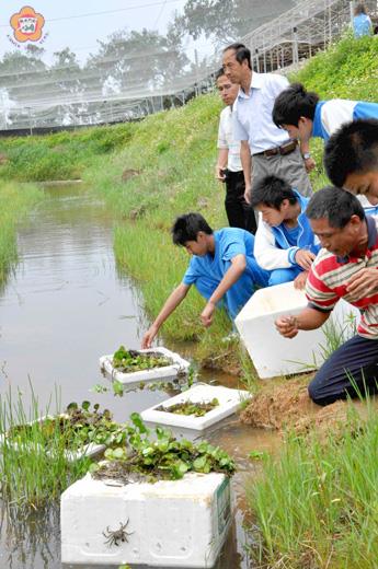 金門農工師生昨天把一千隻大閘蟹放入土池,開始進行粗放養殖;藉由充足的陽光和微藻類,希望有助於大閘蟹快快長大。 金門農工水產養殖科從去年(九十八年)十月引進大閘蟹,由養殖科主任洪鵬飛、教師游育霖帶著學生一起進行試養。 大閘蟹蟹苗的供應商是台灣海大水產商行的鍾明光,他的事業包括蟹苗繁殖批發及養殖技術轉移。 鍾明光表示,在台灣養大閘蟹,養殖環境密度高,回捕率低,投資報酬率不好。金門的夏天與冬天和大陸大閘蟹產地同步,應該可以養出和大陸同樣品質的大閘蟹,因此與金門農工進行合作,由他提供蟹苗,由學校試驗養殖技術。 金門農工養殖科主任洪鵬飛表示,目前養殖科二年級的師生是利用養殖實習課、特色實習課試養大閘蟹。去年十月,他們是在水泥池中養殖大閘蟹,但折損率不低;昨天,他們將飼養半年多的大閘蟹,配合新引進的幼蟹,移池於三口土池中,進行粗放養殖,希望能提高成效。 金門農工農場主任劉溪丁表示,配合大閘蟹的養殖;養殖用的土池已架設了防鳥網和防逃板。 根據蟹苗供應商鍾明光的分析,小水泥池缺少陽光和微藻類,大土池則有充分的陽光和營養源,預期大閘蟹會在土池中生長得很好。 對於大閘蟹的養殖,學生許丕煌表示,大閘蟹有夜間群聚的習性,很好看。林俊鴻覺得養殖科的大閘蟹養到越大,長得越好。賴弘楨認為大閘蟹外表其實很普通,但肉質很鮮美。陳昕呈覺得大閘蟹用蟹鉗吃東西的樣子很可愛。李智華的感想是:大閘蟹長得好慢!陳子妮則希望大閘蟹們快快長大。 金門農工的大閘蟹養殖,曾在全國水產類專題製作中獲得佳作獎;洪鵬飛表示,這些大閘蟹預定在今年十月成熟;養殖是否成功,除了存活率之外,關鍵在於有沒有蟹黃和蟹膏。