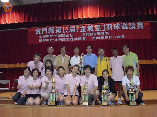 第十三屆金城盃羽球錦標賽,昨日落幕,選手「以球會友」,相互切磋球技,也相約「明年再見」。該項球賽,一連兩天假金城國中體育館進行各組賽程,於昨日告一段落。金城鎮公所主任秘書黃耿銘、金城鎮代會主席陳天成、城中校長楊瑞松、縣羽球運動委員會主委王漢志頒發獎盃獎勵各組績優選手,期許選手們繼續精進球技,未來有更好的成績表現。 該項比賽,各組成績分別為:(一)國小三四年級男生組單打:第一名,多年呂皓鈞。第二名,多年王藍葎。第三名,多年陳冠燊、湖小董峻誠。優勝:金湖國小呂語桐、黃千耀、董竑、蔡介豪。國小三四年級女生組單打:第一名,多年王佳宜。第二名,多年吳燕諭。第三名,金鼎翁晟芳、金鼎翁淑榕。優勝:湖小王岑娜、金鼎翁小雯、陳思璇、楊子嬅。(二)國小五六年級女生組單打:第一名,述美楊九月。第二名,湖小李若晨。第三名,湖小呂佳妮、述美黃鈴渝。優勝:多年葉晨曦、金湖國小王岑琳、呂欣縈、葉妍。國小五六年級男生組單打:第一名,湖小陳佾群。第二名,多年呂浩宇。第三名,金鼎王家林、李靖威。優勝:中正陳律勛、多年陳衍德、湖小張立揚、金鼎翁承鏞。(三)國中女生組單打:第一名,湖中呂佳穎。第二名,寧中翁紫珞。第三名,湖中蔡欣燁、城中李芷嘉。優勝:寧中王韻婷、翁妤涵、湖中莊秀珍、沙中楊舒雁。國中男生組單打:第一名,沙中黃彥昇。第二名,寧中翁偉哲。第三名,城中黃宇綸、城中賴盺。優勝:湖中陳佾頎、蔡孟桓、吳聖鋒、城中薛家和。(四)高中職女生組單打:第一名,金門農工陳秀玲。第二名,金門高中李易達。第三名,金門高中李佳蓉、金門農工張嘉芸。優勝:金門高中李佳諺、黃佳君、金門農工翁佳筠、葉馨。高中職男生組單打:第一名,金門農工翁嘉豪。第二名,金門農工王采晨。第三名,金門高中張雲翔、傅思瑋。優勝:金門高中許翊德、金門農工莊博丞、陳威佑、楊士杰。(五) 社會女子組單打:第一名陳以真。第二名許力蓉。第三名李雅秀。(六)社會女子組雙打:第一名,李佳蓉、李易達。第二名,許力蓉、唐政諼。第三名,李欣玫、楊曼歆。(七)社會男子組單打:第一名,吳德偉。第二名,蔡立安。第三名,李策勵。(八)社會男子組雙打:第一名,蔡立安、謝世祥。第二名,陳世川、葉松青。第三名,吳德偉、呂世竹。(九)社會長青組雙打:第一名,李策勵、王允著。第二名,薛中平、李仁土。(十)團體組,社會男子團體組,第一名,金湖鎮。第二名,金城鎮。第三名,江南商店。社會女子團體組,第一名,江南商店。第二名,金門農工。第三名,金門高中。