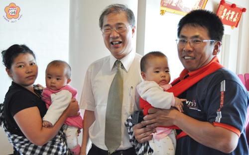 陳麗妤/圖文 「活力新家庭·就是愛金門」外配社區一日遊,縣長李沃士與民同樂,成為大明星,民眾爭搶合影! 來自小金門的洪志強以及孫娟,帶著雙胞胎洪佳及洪雯,和縣長李沃士合影。洪志強說,平日少有出遊,藉由活動攜家帶眷遊金門,每個景點都印象深刻,好玩又有趣,機會難得,謝謝縣府的用心。