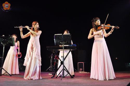 「魅力浯江,藝獻城隍」2010金門國際文化藝術節昨晚舉行「浯江狂放夜」,有請地區知名樂團赤后樂團進行開唱,還有來自台灣的「天籟之音」女子樂坊,更有來自西班牙拉丁「騷莎舞團」的精彩演出,炒熱整場氣氛,讓觀眾度過一個相當歡樂、狂放的夜晚。 浯江狂放夜於昨日晚間七時三十分假莒光湖畔舉行,吸引數百位民眾到場欣賞,昨日的演出由水舞揭開序幕,緊接著安排由地區知名樂團赤后樂團開唱,還有來自台灣上週因金門霧鎖機場,無法降落金門,進行表演的「天籟之音」女子樂坊,更有來自西班牙拉丁「騷莎舞團」演出,演唱多首膾炙人口的電影主題曲,相當動聽,現場有不少民眾還會跟著輕唱。因此昨晚天籟之音女子樂坊一站上舞台,就讓人眼睛一亮,許多男性觀眾,還拿起相機,頻頻拍照。 據了解,天籟之音室內樂團結合了來自全省熱愛表演藝術的音樂老師,目前全省約百位團員,因全數為女性,使樂團倍顯柔美,入團後皆受過專業音樂演奏訓練,著重音樂品質的要求,每場音樂會從編製、選曲、串場主持到音樂會進行的每個階段,都由演出的老師們親自規劃與安排,演出前並有最專業的音樂顧問全程諮詢,對於樂曲的挑選絕對達到溫馨、典雅、浪漫的氣氛,配合精心安排即興演出讓現場所有聽眾感受視覺與聽覺上的享受。 金門縣文化局表示,2010金門國際文化藝術節除傳承延續傳統文化藝術外,活動中更是打造前所未有的全新視野主舞台,炫麗的水舞舞台及炫璨煙火秀,同時再加入創意市集,打造一個全新的金門國際文化藝術節。今(廿九)日晚間七時三十分假莒光湖畔,還將舉行「浯江狂放夜」,邀請醬汁樂團(台灣)、森巴舞蹈團現場進行演出,精彩可期,歡迎大家能攜家帶眷一同前往欣賞。