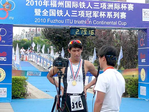 2010年福州國際鐵人三項洲際盃賽暨全國鐵人三項冠軍杯系列賽在福州開賽,經過激烈角逐,地區好手吳冠融勇奪標準賽全程20歲組冠軍,陳孝瑜也獲得半程賽20歲組第一名成績,女生20歲組標準賽,則由張明惠為地區力添一面銀牌,金門縣男女選手表現出色,頗受矚目。 教練蔣光明表示,這場比賽於日昨在福州閩江公園舉行,賽事共吸引七個國家和地區的上千名運動員前來參加,選手要挑戰的是游泳一點五公里、自行車四十公里、長跑十公里,全長五十一點五公里。 地區多位好手在此次比賽中表現傑出,其中吳冠融以2小時06分03秒,拿下標準賽全程20歲組冠軍;成績69分16秒的陳孝瑜,則在半程賽20歲組封王;女生20歲組標準賽張明惠也力守有成,再添一面銀牌,成績為2小時36分45秒。 金門鐵人三項運動委員會表示,此次的比賽突出了三大特色:一是突出海峽特色,因為活動邀請了台灣一百多人參加比賽,兩岸選手同台競技,營造濃郁的兩岸體育文化合作交流氛圍;二是突出福州特色,比賽地點江濱公園展示了其獨特的閩江流域文化特色和榕城風情。三是突出時代特色。既有專業運動員激烈競爭的精彩場面,也有廣大業餘愛好者參與和交流的平台,算是近年來相當成功的運動盛事。