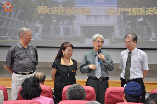 台中巿旅中同鄉聯合會總會長李淑睿一行,今年特別組團參加金門迎城隍活動,昨天下午抵縣府拜會,受到縣長李沃士及縣府團隊熱忱歡迎,連福建省主席薛承泰也到場與鄉親相聚團圓,對旅台鄉親倍極珍惜與重視,充份展現人親、土親,家鄉最親之情感。 薛主席、李縣長昨與台中巿旅中同鄉聯合會「有約」,並相聚在縣府多媒體中心,鄉親們相見歡,相談甚歡,笑聲盈滿堂;薛主席、李縣長肯定李淑睿是金門難得的奇女子,能在台灣公益團體享有好名聲,主要得力於她的「勤快、熱心」,尤其,她在同鄉會期間「憨憨做」,她不忮不求,全心奉獻金門鄉親,深獲激讚。 薛主席歡迎旅台鄉親返鄉探親及旅遊,他昨天由台專程趕回與鄉親見面,他指出,華人社會擁有共同文化,理應團結一心共同發展,尤其是台灣保留許多華人文化與精神,更應互相往來及學習才能有進步。對今年華僑返鄉參與迎城隍活動人數相當多,薛主席與李縣長感到相當欣慰高興。 據總會長李淑睿指出,台中巿旅中同鄉聯合會轄下有11會,參與人數達二、三十萬人,名副其實是個超級「大家庭」,平日投入各項公益團體活動,參與者相當熱絡;她說,人生沒多長,只要能力所及,就抱持「歡喜心情」去做,即能豐富自己的生命彩色與能量。 薛主席強調,今年是浯島邑主城隍遷治330週年慶典,台中巿旅中同鄉聯合會組團33人返鄉慶賀,深富意義;金門在海外華僑人數達七十萬人,不少金門華僑事業有成就,回饋鄉里貢獻社會,實是難得可貴,甚至不少華僑捐款震災等等公益活動,凸顯「華僑是革命之母」。 今年八十四歲的新加坡華僑洪天送,打從年輕即返鄉參與迎城隍活動,前後三十多年回故鄉達七十多趟,只有去年沒回金門;他回憶早年到高雄同鄉會時,因金門無屬於自己會館,當年目睹鄉親席地而坐,當場一陣心酸湧上心頭,為此他曾捐助一百多萬建會館,讓鄉親們擁有一空間。 洪天送說,他二十歲即因金門生活艱困而被迫下南洋討生活。他育有三子,其中有二子常笑他「憨」一生回故鄉無數次,但這次老二隨著他返鄉尋根探源,另外這些年來有許多富有的華僑也跟著他回到心靈的故鄉。他說,他心繫故鄉,只要回家看到故鄉的人,他形容自己的心肝就擱在金門。