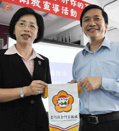 在金門,肝癌排名癌症死因的第一位;在全國排序中,金門的肝癌死亡率位居全國第六位。 為促成全民共同防治肝病的目標,金門縣衛生局已規劃了永續性的肝癌防治行動,可配合金門縣各機關、團體的需求,到指定場所辦理宣導活動(申請的聯絡電話為082-330697轉613,聯絡人為李俊祥)。 金門縣衛生局局長陳天順昨天到金門日報社(本報)進行肝癌防治宣導;聽眾包括社長黃雅芬、印刷廠廠長李金溝等幹部及職員工。 陳天順提醒聽眾,酒精性肝炎是肝癌的成因之一;酒精攝取過量或酗酒,可能導致「脂肪肝」,然後是「酒精性肝炎」,接著形成「肝硬化」,最後就是「肝癌」。 雖然說起來容易做起來難,但是為了身體健康,他建議大家飲酒要能有所節制。他表示,以酒精濃度為58%的金門高粱酒為例;每天的上限為「一口杯」三杯-若超過三杯就算過量。 他甚至建議警察單位,能在喜宴的場合做做酒測,讓民眾知道喝了多少酒精,並勸導喝酒的人醉不上道。 在宣導活動中,陳天順說明了「肝癌的成因」、「誰是高危險群」、「肝癌如何預防」、「肝癌有什麼症狀」、「肝癌如何診斷」、「肝癌如何治療」。 根據他的說明,在金門縣,男性肝癌及肝內膽管癌症居十大癌症發生率的第一名,女性則居第三名。 肝癌的成因包括:病毒性肝炎(肝癌三部曲)、酒精性肝炎、黃麴毒素、基因(致癌基因)。 以「BCLC期別」進行區分,肝癌可分為:○期(有百分之五十到七十五的人可活五年)、A期(有百分之五十到七十五的人可活五年)、B期(有百分之四十到五十的人可活三年)、C期(小於百分十的人可活三年)、D期(存活率平均為三個月)、要預防肝癌,生活上的調適包括:不吸菸;避免過量飲酒;養成規律的運動習慣;避開生活中的致癌物質;安全性行為;避免不必要的打針及輸血等造成皮膚傷口的機會;養成定期篩檢的習慣。 在飲食方面,應該注意:吃新鮮魚、肉、蔬、果;多吃高纖維食物;少吃高脂食品;少鹽、少糖並以蒸、煮方式取代油炸、煙燻;不吃發霉或不明化學成份的食物。 肝的定期檢查建議為每三到六個月做肝功能及胎兒蛋白檢查;每三到十二個月做腹部超音波檢查。 陳天順引用統計數據說:平均每七分十秒,台灣就有一人罹癌。若是一場演說是一小時,演說結束,台灣就多了八名癌症患者。不過,只要能把握「預防勝於治療」和「早期發現早期治療」兩大原則,肝癌就不可怕!