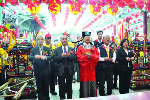 金門「迓城隍」陣頭昨出現在熱鬧的台北街頭?原來是「金門迎城隍·縣長送佛帖」台北記者會昨日熱鬧展開,現場吸引相當多媒體與民眾到場參與,縣長李沃士穿著古代縣太爺官服,送上佛帖給省城隍,由全國城隍聯誼會會長陳光憲代收,李沃士竭誠邀請世界各地的遊客都能到金門來「作客」,感受不一樣的浯島風華。 這項活動於昨日上午十時在台北武昌街上的台灣省城隍廟前廣場舉行,由縣長李沃士主持,包括立法委員賴士葆、政務委員兼福建省主席薛承泰、議長王再生、議會機要秘書陳玉珍、台北市議員吳志剛、台北市議員李仁人、台北市民政局長黃呂錦茹、縣府社會局長方天吉、金酒公司總經理姚松齡、副總經理游鴻程、金城鎮長石兆瑉、浯島城隍廟管理委員會主任委員周浯斌、台開公司董事長邱復生、全國城隍聯誼會會長暨台灣省城隍廟董事長陳光憲等人都到場參與,現場嘉賓、媒體雲集,場面熱烈。 活動開始前,台灣省城隍廟的黑面城隍爺即到路口迎接金門浯島城隍廟神輦,還有聞名已久的八家將出巡等,以神明間的大禮相迎,吸引民眾圍觀,甚至該路段還動員多位警察到場維持秩序。 縣長李沃士、福建省主席薛承泰、議長王再生、財團法人台灣省城隍廟董事長陳光憲等人引領包括金門旅台各同鄉會、金城鎮宮廟長老、與會貴賓等一同遵循古禮,向城隍爺捻香祈福並敬獻水果、燭火、酒等。稍後,在大家的見證下,李沃士也一一致送佛帖給到場的二十多家全國各城隍廟代表。 李沃士在致詞時表示,今年適逢金門「浯島城隍爺遷治330年紀念日」,為讓這項具三百多年傳統宗教活動持續不墜,今年特別擴大舉辦,他帶著一顆虔誠的心,跨海來台親送佛帖,希望邀請台省各城隍廟一起蒞金共襄盛舉,很高興也獲得大家熱情的回應,屆時預計將有全台二十六家城隍宮廟的代表與神明跨海到金門參與,可謂史上頭一遭,相當難得,他也特別代表金門鄉親感謝大家的協助。 李沃士說,每年農曆四月十二日,金門都會舉辦城隍遶境巡安,金門縣政府非常重視這項傳統活動,今年已在金門陸續展開一連串慶祝活動,包含「城心感動迎城隍文化展」、「踩街」、「妝人遊行」、「陣頭體驗」及「明華園黃字戲劇團│周公法鬥桃花女」等重要活動,希望各地的金門鄉親可以相招好友一起回來參加。 黃呂錦茹也代表台北市長郝龍斌對此次活動表示祝福;陳光憲則說,浯島城隍廟今年才剛加入全國城隍聯誼會,排序為33號,剛好與浯島城隍爺遷治330年一樣,都有個33,是個很神奇的巧合。 昨日活動結束後,縣府與台灣省城隍廟還舉行特產試吃,有包括金門貢糖、高粱酒、麵線等金門農特產,而台灣省城隍廟也準備油飯、八寶粥等福食邀請民眾現場試吃,祈福國泰民安,讓大家都過著平安幸福的日子。 (相關新聞見四版)