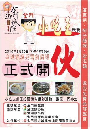 2010年金門迎城隍活動金門小吃王競賽,即將於5月14日截止報名,金門縣政府鼓勵廣東粥、蚵仔麵線、炒泡麵業者,不分男女老少,以「商號名稱」踴躍組隊參加挑戰,角逐「2010年金門小吃人氣王」;獎金最高1萬2千元,千萬別錯過機會。屆時也歡迎鄉親遊客品嚐鑑賞。 縣府建設局指出,迎城隍活動金門小吃王競賽,時間訂於5月20日下午四時報到,比賽時間自下午四時三十分至五時三十分,地點在總兵署前廣場,報名方式即日起至5月14日止,自行送達報名表至金城鎮後浦商圈發展協會(地址:金城鎮莒光路102號/電話:0932-897667吳總幹事)。 迎城隍活動金門小吃王競賽,將分廣東粥、蚵仔麵線、炒泡麵三個主題組,參賽隊數每組以5隊或總隊數以15隊為限,以報名先後順序為準。比賽方式,每一參賽隊伍以2人為限,需於限制時間中各烹調出100人份之主題料理,供現場民眾試吃(試吃餐具由主辦單位提供)。 縣府建設局表示,製作時間50分鐘,完成後,另給10分鐘將一式5份料理布置在指定的展示桌上待評審審查、進行清潔,並做盛碗準備工作。參賽者可先備妥高湯,除洗滌外,參賽者不得攜帶成品,但可帶半成品入場,需經評審檢查同意始可進入,違者取消參賽資格。 至於,爐具、瓦斯由主辦單位準備。其餘食材、用具皆由參賽者自行準備,每組補助材料費用3,000元。比賽時間開始後,超過10分鐘未到場者視同棄權。比賽時間截止前3分鐘響鑼提示,最後30秒進行倒數計時。比賽時間截止後,未完成之料理,不列入評比。不同參賽隊伍不得交談,違者扣總分2分。 縣府建設局表示,評分標準依口味:30%、創意:30%、觀感(刀工、火候、外觀):30%、衛生(包含服裝儀容、善後工作):10%;評比:評審團分為專業評審組與一般評審組,以總分較高者為優勝。專業評審組:由主辦單位遴選專業人士組成,評分占70%。一般評審組:評分占30%,由現場票選,第1名得30分,每隔1名遞減2分。 有關獎勵:各主題類組取金、銀各1名,各頒發1萬2仟元、6仟元及「2010金門小吃王」認證獎牌。票選最高者授予「2010年金門小吃人氣王」認證獎牌。若報名隊數不足,或未達評審要求標準,得以從缺。獲獎者應依中華民國稅法規定負擔稅金。 競賽表單下載網址(金門縣政府建設局全球資訊網http://www.kinmen.gov.tw/Layout/sub_F/index.aspx?frame=19),若有任何疑問,請洽金門縣政府建設局工商課 082-326204。本辦法如有未盡事宜,以主辦單位現場說明或公布為準。主辦單位:金門縣政府;協辦單位:金門縣餐飲同業公會、金城鎮公所、金湖鎮公所;執行單位:金城鎮後浦商圈發展協會。