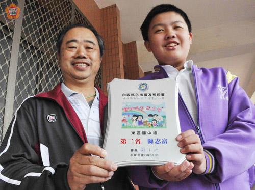 毋忘在莒,毋忘母愛!金湖國中學生陳志富在內政部入出國及移民署所辦理的「媽咪與我的家『話畫』」比賽活動中得到東區第二名;他畫的是太武山「毋忘在莒」勒石前的媽咪與家人。 美術教師楊天澤和七年五班導師洪珍珠表示,陳志富是一個很懂事的學生;母親節前,學生們都製作了母親卡,但他和別人特別不一樣,做了一個母親節禮盒-裡面裝了巧克力、故事書、自製的壓花、母親卡……。洪珍珠說,她沒看過這麼體貼的孩子。 楊天澤表示,陳志富在美術上的表現向來不錯,最近在飛航安全壁報比賽也曾獲得佳作。 陳志富的母親原籍四川;他表示,他對媽媽的印象就是時時刻刻照顧著他;他希望以後能賺很多錢給媽媽! 根據金湖國中提供的說明,內政部入出國及移民署為鼓勵新移民子女從繪畫中發聲,跨越語言與文字的藩籬,畫出心中媽咪對家人的愛,舉辦了「媽咪與我的家『話畫』」比賽活動。 活動辦理的期間為今年(九十九年)三月一日至三十一日;共有一千九百八十四位新移民子女報名參加。 比賽分為北、中、南、東(含離島)等四區;每區分為國小低年級、中年級、高年級及國中組。每區選出各組前三名及佳作頒給獎牌、獎狀及禮券-得獎者共計七十二名。第一名可獲禮券一萬元;第二名可獲禮券六千元;第三名為禮券三千元。東區的參賽者有三百一十六人。 參賽者的上一代(母親或父親)來自大陸(六百五十四人)、越南(六百三十三人)及印尼(三百五十七人)、菲律賓、柬埔寨、泰國、馬來西亞、緬甸、香港、日本、韓國、美國、新加坡、澳門、巴基斯坦、尼泊爾、埃及、印度、英國。
