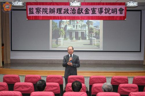 參加鄉鎮民代表及村里長選舉候選人,如欲收取政治獻金,應依法申請許可設立政治獻金專戶。 監察院公職人員財產申報處昨日上午九時起,在金門縣政府多媒體簡報室舉辦政治獻金宣導說明會,並有許多鄉鎮民代表及村里長候選人和助理到場聽講。縣府民政局長翁伸金也出席與會,介紹主講人監察院公職人員財產申報處處長洪國興、約聘專員王嘉蘭、蕭遠芳、辦事員蘇愛智。 洪國興指出,候選人開設一個政治獻金專戶對自己有好無壞處,去年選舉,該處就移送三十個,這當中還有縣長候選人未依規定開設專戶而收取政治獻金,面臨刑事上及被罰鍰的後果。 洪國興指出,政治獻金係對於從事競選活動或其他政治相關活動之個人或團體,無償提供之動產或不動產、不相當對價之給付、債務之免除或其他經濟利益。參選人於收受政治獻金前,必須依法申請監察院許可設立政治獻金專戶。而參選人得收取政治獻金之期間,為自監察院許可設立政治獻金專戶之日起至九十九年六月十一日止。 洪國興指出,擬參選人未經許可設立專戶而收取政治獻金者,處三年以下有期徒刑,得併科新臺幣二十萬元以上一百萬元以下罰金,其收受之政治獻金沒收之,不能沒收時,追徵其價額。為擬參選人收受政治獻金之代理人、受雇人,及為政黨、政治團體收受政治獻金之負責人、代表人或代理人、受雇人,違反者,亦依前開規定處罰。而政治獻金專戶經監察院許可後,非經監察院同意,不得變更或廢止。
