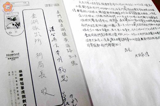 一對來自大陸山東省的老夫婦鄧清海(八十歲)、王玉美(七十二歲),上個月經由金門到臺灣旅遊。老夫婦於四月十九日在金門夜宿福華飯店,由於與金湖分局在同一條路上,便就近向金湖派出所求助,希望警察能幫他們尋找三個在台失聯的姪女;隔天(四月二十日),警察以電話告知他們三個姪女的下落。 老夫婦在四月二十日當天就與三姪女在臺北碰面;當天晚上,他們夜宿臺北縣萬里的福華渡假飯店,就以飯店的信箋和信封,寫信給金門縣警察局局長,表達感激之意。 夫婦兩人在信中表示,他們來自山東青島;他們有三個姪女在台,卻因為雙方在台海兩岸的地址都已經變動,日思夜念,卻無法取得聯絡。這一次,他們隨團到金門、臺灣旅遊;夜宿金門時,乘機向金湖派出所的值班警察陳永林求助。 根據他們的描述,陳永林很熱情地接待他們,而且「態度勝似親人」;第二天,陳永林就以電話告知他們三個姪女的下落-其中,老二在臺北,老大和老三在臺中。 信中提到,四月二十日當天下午二時,夫婦兩人已在臺北與老二見了面,還拍下了照片留念;四月二十一日,他們又約在臺中要與老大和老三見面。 老夫婦表示,陳永林辦事如此認真,對大陸同胞如同親人一樣,讓他們非常感動,因此寫信表示感謝。 老夫婦的信雖然寄到金湖派出所,但收信人寫的是「柯局長」(金門縣警察局局長是柯昌良);縣警局要督察室查明後敘獎。 金湖分局表示,員警陳永林在這件事情上,發揮了同理心;他憑藉老夫婦所提供的姓名及住址等簡單資訊,藉著專業職能,圓了老夫婦尋親的心願,讓對岸同胞感受到警察服務的主動積極和用心任事。