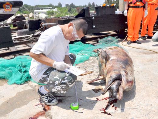 別名「媽祖魚」的中華白海豚,昨日清晨被發現擱淺死亡於古寧頭海域。縣府獲報後聯繫金門籍漁船出海,歷時三小時在海岸巡人員、漁會的協助下,動用吊車移往新湖漁港進行解剖研究,以查明死亡原因,並且將製作骨骼標本,作為教學展示用途,以宣導海洋保育。 金門縣政府農林課於昨日上午六時許,接獲台灣大學生態學與演化生物研究所團隊通報,金寧鄉烏沙頭海域發現疑似豚類擱淺死亡。農林課課長李廣榮指出,獲報後緊急聯絡金門籍金豐六十八號漁船前往,歷經三小時後將豚屍打撈上岸,並在海岸巡以及金門區漁會的協助下,動用吊車移往新湖漁港進行解剖研究,以瞭解死因。 李廣榮也表示,獲報的同時已向農委會林務局保育組、中華民國鯨豚協會等通報,並且有請台大鯨豚研究室研究員抵金協助解剖研究。 台大鯨豚研究人員郭祥廈表示,死亡的中華白海豚,身長約二點三公尺,體重超過一百五十公斤,為雄性成豚。從其身體纏繞的漁網情況,研判可能為追捕魚群時受漁網困住,以致呼吸困難窒息而死。由於其眼外凸,生殖器、內臟器官已移位,推算死亡時間約五至六天。 郭祥廈也指出,中華白海豚為稀有動物,台灣海域一年四季都曾發現其蹤跡,尤其是西海域約有一百餘隻;而金廈海域推估也超過五十隻之多。而兩岸中華白海豚間的互動等是目前熱門話題,但都待解謎。 不過,金廈漁民對中華白海豚有一致的說法,那就是漁民認為中華白海豚常於農曆三月二十三日媽祖聖誕時出現,是給媽祖拜壽,故別名「媽祖魚」。 李廣榮指出,昨日被發現擱淺死亡的中華白海豚,已是地區今年發現的第四隻海豚死亡紀錄,經解剖處理作為研究後,骨骼部份將製作成標本,擬置於水試所等展示,宣導海洋生物保育之重要並作為教學參觀之用。
