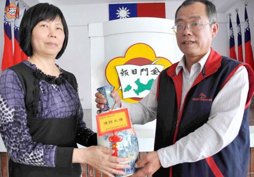 張建騰/圖文 情誼永懷! 民國六十五年就在金門日報社任職的許能慧,即將於五月一日退休;金門日報工會的常務理事王根圍昨天代表全體員工致贈紀念瓶給她,以示「情誼永懷」。 在王根圍及金門日報社印刷廠廠長李金溝心目中,許能慧工作認真、待人和氣,沈默寡言,沒有心機。