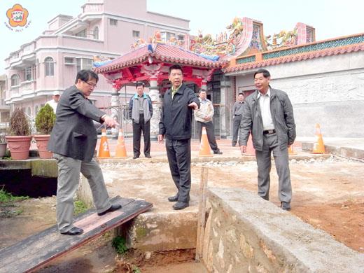 金城鎮泗湖村民反映泗湖村代天巡狩廟旁農田擋土牆整建,造成農民進出耕作的不便,鎮長石兆日昨日上午前往實勘(見上圖,李金鎗攝),並召集附近土地業主進行協調取得共識,要求營造廠商配合民眾需求辦理改善,拆除部份擋土牆並將農路鋪面,以方便農民從事農作。 金城鎮公所進行「珠沙里環境改善工程」,民眾反映泗湖村代天巡守廟旁農田擋土牆整建,將原先連接農田的土路破壞,造成日後農耕的不便,因此要求鎮公所進行改善,鎮長石兆日昨日上午前往實勘,並召集附近土地業主進行協調,希望取得各界共識。 正在施建的擋土牆下方,原先為大排水溝,主要為收集附近山坡所留下的雨水,平常水涸泥乾,農民進出無慮,鎮公所將原先堆積的土方清除,還原為原先排水溝,卻造成平日靠著這條「便道」進出的農民,大大不便。 經過石鎮長協調鄰近土地業主,最後取得大家的共識,將調整現有的擋土牆,並兼顧排水溝的功能,設置斜坡方便農車進出。石兆日並要求監造、營造廠商配合民眾需求辦理改善,務必獲得大家認同,讓工程順利完成。