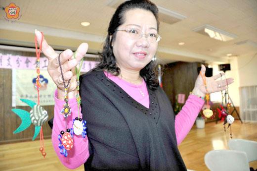 張建騰/圖文 接蟹足,加魚翅;蛤蜊殼,變吊飾! 婦聯青溪金門縣支會金湖支分會辦理九十九年度健康及手工藝研習。研習會中由講師林沛綺指導青溪姐妹利用蛤蜊殼做吊飾。 林沛綺把蛤蜊用花布包藏並縫合,加上魚翅、尾鰭就變成熱帶魚;加上節足、鋏腳就變成螃蟹。配上中國結,就成了精美的吊飾。 林沛綺表示,發揮創意,善用不同的花布和紋路,就會使飾品更加出色。