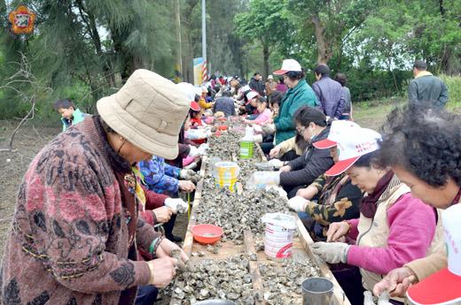金寧鄉第八屆石蚵文化節的重頭戲「千人剝蚵」體驗,成千的民眾將現擎八千公斤重的帶殼石頭蚵剝個精光,帶回古寧頭獨特的「石頭蚵」嚐鮮,人人樂開懷。 鄉公所今年援例再辦理千人剝蚵體驗,綿延近五百公尺的巨長「蚵桌」,從北山通往蚵田的產業道路串連到出海口處,坐滿了人潮,場面的壯觀,成了活動的熱點。 現場除了老蚵民,大部份多是從各地前來參與剝蚵的民眾,還有許多家長利用周末假日帶著子女前來體驗剝蚵,要讓新生代的草莓族感受討海人的辛苦生活。 縣長李沃士也由鄉長陳成勇引領到現場為大夥「打氣」,受到現場民眾的熱情歡迎。李沃士、陳成勇親切和民眾打招呼,也叮嚀大夥要注意銳利的蚵刀,不要傷了手,大家歡喜體驗剝蚵,帶著親手剖的石頭蚵回家嚐鮮。 這項「千人剝蚵」活動,民眾參加踴躍,不但是自己剝的蚵可帶回家,參加者還有酒粕面膜的好禮,鄉公所表示,今年參加的民眾更踴躍,超過活動預定的千人人潮,鄉公所提供現擎八千公斤重的帶殼石頭蚵,讓大家開心體驗。 活動現場也吸引許多圍觀的民眾,有的小朋友還親自體驗剝蚵的不容易和辛苦,許多文史工作者也以鏡頭做真實的紀錄。參加剝蚵的民眾,從阿公、阿嬤到小學生都有,不分男女老少,有如全民運動,大夥坐在蚵桌,專注的剝蚵,老手展露剝蚵的快準功夫,剝蚵刀迅速地刺破堅硬的外殼,挑出「蚵仔」,一粒接一粒,裝入袋中。新手雖然動作慢,但也歡喜體驗到剝石頭蚵的辛苦。今年的石蚵較小粒,雖然鄉公所還是如同往年一樣的提供八千公斤重的帶殼石頭蚵,但是民眾所剝的量會較少,民眾說,有體驗就好。 陳成勇說,舉辦千人剝蚵體驗,也是最真實的生活教育,讓新生代更惜福珍惜現有的生活環境,同時也透由活動,鼓勵更多人來接近天然的石頭蚵,有所體驗和感受,一起協助鄉公所來推銷古寧頭獨特的石頭蚵土產,吸引更多消費者來購買天然「尚好」的石頭蚵。