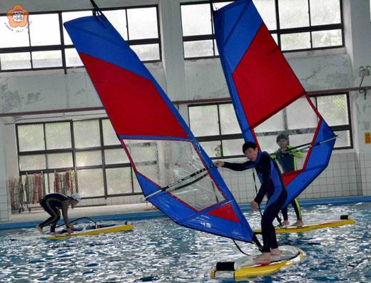 玩水好好,水好好玩;好好玩水,別被水玩!金門農工為應屆國中生舉辦了水上活動體驗課程,學員們嚐試過浮潛、獨木舟、風浪板的滋味後,有人說,要是活動早一點辦,就會想要改唸漁業科了! 「國立金門高級農工職業學校98學年度應屆國中生水上活動體驗營」於四月十七日(前天)、四月十八日(昨天)在學校內外的泳地、操場、湖泊進行,項目包括浮潛體驗、獨木舟及雙人舟體驗、沙灘車體驗、風浪板體驗、大龍舟體驗。金門農工校長陳水芳表示,金門的觀光發展,要能與水上活動結合才能吸引年輕族群。 在活動中擔任講師的教師包括王永仁、蔡天益、林仲宏、蕭承胤等。學生們在活動中認識了漁業科水上活動設備及安全注意事項;認識了「浮潛三寶」-面鏡、蛙鞋及呼吸管。學習讓獨木舟、雙人舟下水、前進、後退、進行大C轉彎及直角轉彎;學習在龍舟上操舵、操槳前進、後退擋水、轉彎競速奪標。 昨天上午的課程是風浪板體驗,由王永仁等人示範及講解如何組裝、下水、起帆、方向控制及駕駛,還有簡單的保養。 根據王永仁等人的說明,起帆是要用身體後仰的力量。在風浪板上,身體應與帆呈V字型,以保持平衡。雙腳要前後開立或左右開立,穩住中心。順風時是靠尾舵直線前進;逆風要用中央板曲線前進;無風時可以搧帆前進。 玩水好好,水好好玩;好好玩水,別被水玩!參加體驗的國中學生包括陳鈺茹、李思穎、許繁榮、翁崇瑋、楊鎮嶽、葉家瑋等。學生們在課程中學到了如何玩水而不是被水玩。
