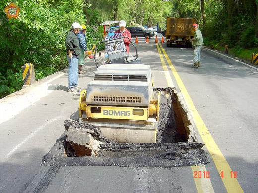 養工所的壓路機昨天下午在太湖路一段(陽明湖附近)壓路修補路面,意外壓斷了道路!道路是因為被掏空而坍落,車子隨之陷入塹坑,工作人員受到輕傷,道路隨即進行封鎖。 根據養工所課長陳遠傑、李增憲等人的說明,養工所獲報太湖路一段的道路下陷,於昨天派出壓路機鋪上柏油;沒想到車子在下午二點半左右震垮了道路,二、三噸重的壓路機陷入坑中,並在三點十分左右,由養工所以十五噸重的吊車吊起。 據陳遠傑的目測,陷落的坑塹,深約一點八米,寬約兩米,長約四米;道路寬約八米。陷落的部分是太湖路一段往山外的左線車道;但右線車道的路基也已淘空,只剩下道路的表層。 事發之後,養工所在太湖路一段的兩端放置警示錐,兩端分別由養工所人員和金湖分局警員指揮車輛改道,只容許機車通行;不過,四點之前,警員下崗之後,許多車輛仍無視警示錐的用意,進入危險區域;結果大部分的汽車見狀後折回,還有兩部汽車(包括一部計程車)仍強行由路緣通過。 許多機車司機路過時,都說「太撼了」(太震撼了,太誇張了)!有一位女騎士回憶起在十八年前曾載著兩個孩子摔進坑中,當時她肚中還懷了一個;她希望加強警示,因為散步的人也可能掉下去。 昨天下午四點十幾分,養工所運來了紐澤西護欄將坑塹兩端的道路封閉並設置警示燈。 陳遠傑等人表示,由於道路損壞嚴重,必須請工務局招標修護;這段道路,至少得封閉十幾天。 記者張建騰/綜合報導 太湖路一段因道路崩坍,已在擎天路口段實施封閉,金門縣政府工務局請來往車輛請改道行駛! 金城往山外方向車輛,由環中路經過經武路後,需右轉公園路,改走環島南路,轉市港路,進入山外市區。 山外往金城方向的車輛,應避免走太湖路,可直接走市港路與環島南路,接伯玉路,進入金城。