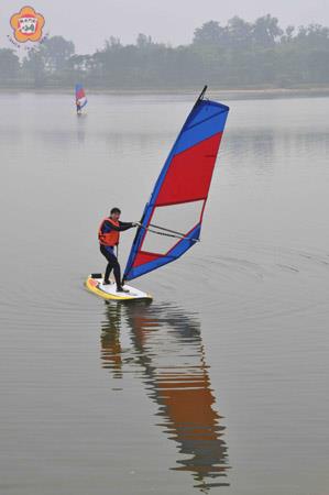 張建騰/圖文 霧中風情畫,湖裡浪漫遊;水上弄碧波,心下樂消憂。 金門農工職校開辦了風浪板的課程,並將於下周六、日舉辦國中生水上體驗活動。 金門農工職校漁業科主任與教師們昨天先在湖裡試行駕馭,這是農工風浪板第一次在泳池以外的水上揚帆。