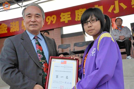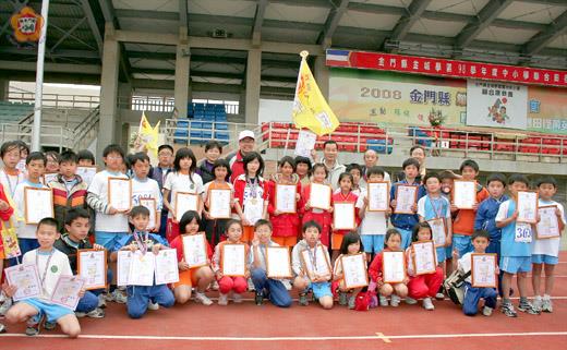 金城學區九十八學年度中小學聯合田徑錦標賽,經一連兩天的競技昨日圓滿落幕,參賽的選手計有十六項二十六人次破大會紀錄,中正國小是最大贏家,拿下三至六年級田徑總錦標。縣府教育局局長李再杭等來賓也應邀到場頒獎表揚績優的選手和團隊,嘉許他們在運動場上的優異表現。李再杭鼓勵學子們要多運動強身,有了健康的身體,也要在課業上力求上進。 這項學區運動會,於昨日下午四時二十分舉行閉幕典禮,由大會會長楊瑞松主持,包括:縣政府教育局局長李再杭、金門技術學院學務長董燊、金城鎮長石兆日、鎮代會主席陳天成以及金城學區各國小校長張峰德、李仁木、董國正在場觀禮祝福。 教育局長李再杭以及來賓們應邀頒獎獎勵各績優團體以及個人和破大會紀錄的選手,對獲獎班級與個人表達道賀肯定,稱許他們在一連兩天的各項競賽中,展現運動的潛能,以實力技壓各參賽選手。 李再杭指出,體育運動除了競技比賽外,也要注重平時鍛練,期盼每位同學都能天天運動,時時運動,對自己的健康就是一種保障,每個人健康就能增強我們社會力、國家力,提昇整體競爭力。所以透過運動比賽能提高同學多多運動、參與。 鎮長石兆日也勉勵學子們從比賽中學習「勝不驕、敗不餒」的運動精神,將來不管做任何事也都要有運動員的精神,只要肯努力,一定會成功。 大會會長楊瑞松感謝家長會以及各界的關懷,贈送飲料,為學子加油打氣。他也感謝工作人員這兩天的辛苦,讓活動順利圓滿,各校同學為選手加油打氣,也增添運動會熱鬧的氣氛,洋溢著活力。楊瑞松也表示,這一次的運動會,兩天共展開一百四十九場次田徑競逐,包括有學區金城國中、中正國小、古城國小、賢庵國小等校總計一千三百七十六位選手參賽,有十六項二十六人次破大會紀錄,學生們展現運動潛能,為學校也是為個人爭取榮譽。楊瑞松也期待下一次的運動會,選手們有更好的成績表現。 該項運動會計有十六項二十六人次破大會紀錄,他們是:國中八男鉛球許維麟成績12.09m、陳昊恩11.23M破大會紀錄。國中八男梁佑銓跳遠5.94m破大會。國中八女李佳齡跳遠3.88m破大會。國中九男林思辰200公尺成績23"81破大會。國小六男400M接力中正顏廷儒、翁凱威、李勻凱、蔡易宸成績58"82破大會。國中七女跳遠成績王意婷4.22M、朱珮文4.10M破大會。國小五女中正周嘉燕400M成績73"61破大會。國中八男林豐盛1500M以4'56"17成績破大會。國中八男陳昊恩鐵餅以33.32M成績破大會。國中七男孫福鈺跳遠以5.25M破大會。國小六男許庭恩鉛球以10.87M破大會。國中九男倪錦祥100M以11"43破大會。國小五女400M接力周嘉燕、歐陽妮妮、莊文芯、盧奇皇以61"23破大會。國小五男400M接力黃耀德、吳崇偉、薛俊隆、翁松源以61"78破大會。國小六男400M接力顏廷儒、翁凱威、李云凱、蔡易宸以58"82破大會。國中七男鐵餅黃智瑄以29.25M破大會。