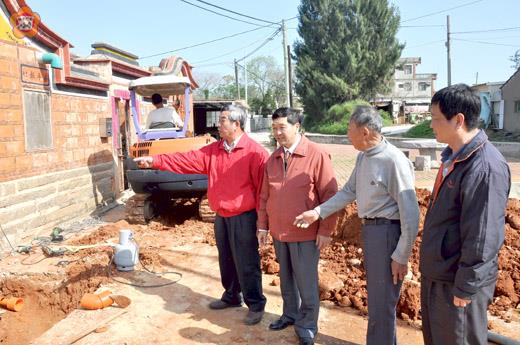 金寧鄉的盤山、后湖、湖下三個村落,縣政府正進行污水管線及家戶接管工程,鄉長陳成勇昨日再度到現場察看工程施工情形,對於民眾反應縣府未能如同后湖、湖下兩個村落編列石頭舖面的經費,陳成勇回映鄉公所已主動委由規劃設計公司先做好設計規劃,將積極向縣府爭取石頭舖面的經費,來提升整體的環境景觀。 陳成勇關心盤山、后湖、湖下三個村落的污水管線及家戶接管工程,經常到工地察看工程的施工情形,也聽取家戶的意見反映,要求承建商要確實做好工程的品質,尤其是進行家戶的接管,更要注意接管的工程,以免日後造成民眾家戶污水排放出了問題。 盤山村代村長翁水河也反映縣政府在盤山、后湖、湖下三個村落同時進行污水管線及家戶接管工程,但后湖、湖下兩個村落,不但編列有工程水泥回填的經費,也同時要做石頭舖面的建設,卻獨漏盤山村,只編列有水泥回填的經費,未能全面性提升整體的環境景觀,建議縣政府能比照后湖、湖下兩村,同時做石頭舖面的建設。 陳成勇回應說,他也關心該項問題,也向縣政府工務局和建設局提出民眾的需求和反映心聲。陳成勇說,鄉公所也主動委由規劃設計單位,針對盤山村的污水管線及家戶接管工程,也配合做石頭舖面以及門口埕建設的規劃設計,並分三期進行規劃,已完成林厝、下堡的規劃設計案,所需石頭舖面和門口埕建設經費約新台幣三千萬元,將向縣府提出申請補助建設經費,後續會續進行頂堡、仁愛社區的規劃設計案,在獲得縣府的經費補助後,會立即投入建設。