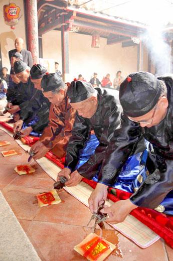 「文武世家」-瓊林蔡氏,昨天在家廟舉辦春日祭祖活動。祭神如神在,事死如事生!當祭祖活動進行時,祖先的「神座」要一一被請出神龕,供養如生。 瓊林蔡氏一年有兩次祭祖活動,春祭是在農曆二月七日舉行,秋祭是在農曆十月六日舉行。 瓊林蔡氏自宋代移民自光州固始,再遷於同安及金門許坑;到了蔡十七郎才奠基於平林,成為瓊林蔡氏的開基始祖,距今已有八百多年。 由蔡十七郎算起,瓊林蔡氏的第五世祖是蔡靜山因為開廓基業,成為「不祧之祖」,也就是「創業之祖」。瓊林春祭之日即為瓊林蔡氏五世祖蔡靜山的忌辰,秋祭之日則為五世祖妣顏氏的忌辰。瓊林的春日祭祖分為「頭亭」和「二亭」。「頭亭」是祭始祖蔡十七郎以下,二世到二十四世的祖先;二亭則是祭五世祖蔡靜山以下,包含六世到二十四世的祖先。 在昨天的祭祖活動中,蔡氏子孫蔡青木、蔡水正、蔡欽水等人,將神龕中的神座請出神龕,依次入席,由蔡氏家族以牲醴庶饈果品香楮之儀,體現「祭神如神在」、「事死如事生」的儒家禮法;主祭及陪祭的長老則包括:蔡振國(主祭)、蔡天賜、蔡成烈、蔡其傑、蔡炯萼、蔡顯清、蔡振來。