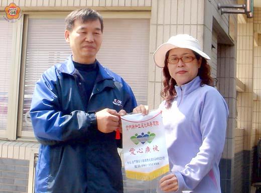 新敬業機車行董事長楊肅謙,回饋社會關懷弱勢不遺餘力,他到金沙鎮晨光教養家園捐款作愛心,鼓舞院生。園長施美珠回贈錦旗致意,也代表全體人員表達由衷的感謝。 楊肅謙日前捐款新台幣兩萬元給私立晨光教養家園,由園長施美珠代表接受。施美珠感謝他對園方的資助和對園生的關愛,也形容此舉讓院生感受社會的重視。特別是楊董對晨光的關心不斷,去年曾贈送涼被給每位院童,今日再次捐款協助,除了感謝還是感謝。 施美珠也回贈「愛心廣被」錦旗,感佩他的善行。