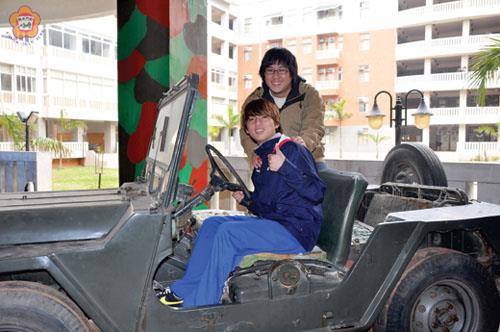 許加泰/圖文 隨著金門解除戰地政務,昔日捍衛金門的軍事戰車、大砲,以及軍用卡車等,也紛紛卸下戎裝,「功成身退」,成了「古董」,也成了觀光客拍照留念的鏡頭。 金門技術學院運動與休閒系師生運回一輛廢棄的軍用吉普車,置放該校綜合教學大樓的中庭,讓學生有機會體驗乘坐古董「吉普車」的箇中滋味。廖晉潁、吳景健兩位同窗是第一次坐上吉普車,雖然古董「吉普車」動彈不得,但也覺得很新奇,也很有趣。