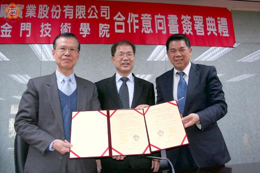 為創新營運提高生產效能,金門酒廠實業股份有限公司和國立金門技術學院昨天簽署合作意向書,縣長李沃士等人到場見證,並期許產業龍頭和金門最高學府結合,共同為金門產學發展攜手合作,借重這些專業人才來促進公司業務發展,讓金酒立足金門、行銷兩岸、佈局全球。 金酒公司和金門技術學院簽署合作意向書儀式,於昨日下午三時在金門技術學院教學大樓二樓會議室舉行,由金酒董事長李清正、金門技術學院校長李金振代表雙方簽約。縣長李沃士、縣議會機要秘書陳玉珍及縣府財政局長黃景舜、教育局長李再杭、金酒公司姚總經理和各組組長及技術學院師生見證下,簽訂合作意向書。 根據合作意向書,這項產學合作,將由金門技術學院協助金酒公司成立投資公司、朝多角化經營;推動行銷大陸市場,營造業績倍增規模;建立現代化廠務管理,提昇產銷效率;協助強化技術競爭力;建構金酒文化等。金酒公司則依新增的營收利潤提撥一定比例予金門技術學院協助校務永續發展。 李沃士表示,金酒公司為金門的產業龍頭,金門技術學院為金門最高學府,產學合作跨出第一步,期待金門技術學院提供的人力資源庫,共同來帶動金酒公司產業的發展,促進金酒研發、行銷的成長有進步的空間,讓金酒立足金門、行銷兩岸、佈局全世界,大的方向需要許許多多專業人才來協助,金酒公司跨出這步尋求合作的夥伴,而金技在這方面也有專業人才與學校特色,希望對金酒公司有幫助的,大家攜手合作共同來帶動金酒公司產業的發展。 李清正也指出,金酒公司和金門技術學院簽定合作意向書,公司和學術單位攜手合作,具有相輔相成功能。金酒公司目前需加強部分是行銷管理,將優質金門高粱酒行銷到世界各地,需要更多的專業人才,希望產學的合作,帶動金門的發展。李清正說,經營多角化為金酒公司重要任務,將來要做轉投資,開發新產品、開放市場都需要專業人才,而金技在地區的學術研究有很好地位,有專業人才,如能借重這些專業人才來促進公司業務發展。 縣議會機要秘書陳玉珍也代表王議長來參與這項意向書簽證做見證,對合作協議表達肯定與支持,希望能帶動地區產業發展。(開車不喝酒)