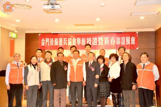 金門縣後備憲兵協會第二屆幹部授證暨新春聯誼活動,昨日舉行,福建省政府秘書長曾華德期許該會在新任理事長楊應雄的領導下,展現憲兵退而不休的服務精神,服務後憲袍澤,也服務鄉親。 該項活動於昨晚六時舉行,由理事長楊應雄主持,福建省政府秘書長曾華德、二零四指揮部副指揮官張勇剛、金寧鄉長陳成勇、議員歐陽儀雄、立委陳福海辦公室主任黃秀珍到場表達賀意。該會卸任理事長張春傳、許永富和後備袍澤暨眷屬共聚一堂參與活動。 張勇剛應邀頒發該會聘任的榮譽顧問證書予歐陽儀雄、李增遨、孫惠文、王明宗、陳天保、劉同欽,借重服務社會的經驗,協助該會推動會務。張勇剛肯定該會致力推動會務的成果,也期望後憲前輩們多多為現役學弟、學妹加油打氣。 楊應雄也頒發該會新任理監事當選證書予常務理事:李增壽、楊廷標、洪榮吉、李錫瑜;理事:陳忠飛、翁自然、李錠金、林仲輝、黃奕龍、許燕樂、陳雄平、王石堆、吳聯福;常務監事:陳金敦;監事:陳金城、王國棟。楊應雄感謝卸任的張春傳、許永富為該會所投入的心力,也奠下良好的基礎。他說,未來會結合理監事繼續推動會務,爭取更多的資源,透由組織的運作,服務後備袍澤,也服務鄉里。 曾華德指出,憲兵是鐵衛隊,學有專長,素質整齊,退休後散居各方,是維持社會安定的一股力量,他期望金門的後備憲兵發揮退而不休的服務精神,繼續奉獻一份力量,促使社會更祥和。 金寧鄉長陳成勇也敬佩憲兵的忠誠。他說,每位憲兵並以「一日憲兵、終身憲兵」為自許,憲兵在營是良兵,在鄉是良民,後憲有著優良的傳統,必定是維持社會安定的礎石。黃秀珍也說,憲兵人才濟濟,金門優秀的人才也在憲兵。 卸任的許永富說,該會會務有一點小成績,最大的支柱是後備司令部和金門憲兵隊大力的支持,幹部們也展現團隊的精神,合力推動會務。 楊應雄也代表贈送紀念品予許永富,感謝他任內經常出錢又出力,並聘任許永富擔任該會榮譽理事長,借重他的服務經驗和熱心,繼續參與會務,讓金門後備憲兵協會更茁壯和發展。