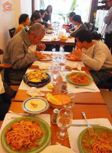 福田教養家園日昨為院生安排社區適應課程,社工黃伊薇帶領十名院生到經典義大利餐廳學習用餐禮儀(見上圖,陳麗妤攝)。多數人都第一次到西餐廳用餐,大家說,好開心、好好吃。 福田教養家園十名院生,在社工及兩位教保員陳寶秀、陳珠琴的協助下,首次走出園區到西餐廳用餐,社工黃伊薇形容,這是社區適應課程之一,過去曾帶學員去挖花蛤、吃火鍋、到林務所踏青,為讓學生嚐試及學習不同的用餐方式而作此規劃,並順道指導院生認識用餐禮儀。