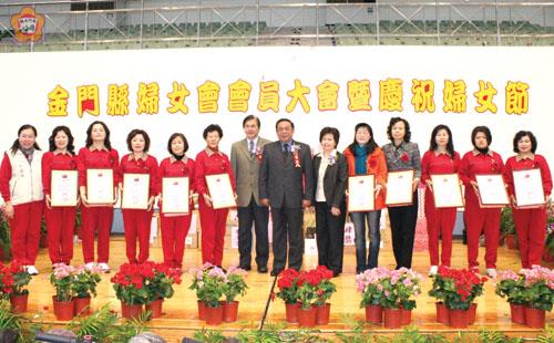 金門縣婦女會昨日假縣立體育館舉行「金門縣婦女會九十九年會員聯誼暨慶祝婦女節活動」,在腰鼓大會串、婦女趣味競賽與摸彩活動中,婦女會姊妹同聚一堂聯誼、歡慶佳節,福建省政府秘書長曾華德、縣府主任秘書盧志輝等貴賓到場頒獎表揚績優小組長,向婦女朋友祝賀,肯定婦女對家庭和社會的貢獻。 縣婦女會這項會員聯誼暨慶祝婦女節活動昨日上午九時許在縣立體育館展開,由婦女會理事長許華玉主持,包括福建省政府秘書長曾華德、縣府主任秘書盧志輝、縣府社會局長方天吉、主計室主任李秀荷、議員洪允典、洪麗萍、林孫全、林務所所長葉媚媚,及金湖鎮長蔡西湖、金寧鄉長陳成勇、金城鎮公所秘書黃耿銘、金城鎮代表會主席陳天成、國民黨金門縣黨部主委黃原亮等貴賓出席,向婦女們賀節致敬。 昨日活動中由五鄉鎮「腰鼓大會串」精彩表演熱鬧開場,隨後由福建省政府秘書長曾華德頒獎表揚婦女會各鄉鎮績優小組長,包括:金城分會陳招治、田麗莉、林明勵;金湖分會陳玉梅、廖玉梅;金沙分會楊赤玉、蔡進治、蔡仙配;金寧分會李玉昭;烈嶼分會許月治等十位,並向她們道賀。 許華玉除感謝婦女姊妹的踴躍出席參與,及婦女會所有幹部無私無我的付出外,她也指出,今年婦女節廈門市翔安區婦女聯合會特別舉辦盛大的「紀念三八國際勞動婦女節100週年暨巾幗風采展示活動」,金門縣婦女會也組團前往廈門參與,除了與來自各地的婦女姊妹聯誼,重點是介紹金門的傳統藝術文化,與推銷金門的觀光產業及金門高粱酒,而在活動中參與表演也得到優勝獎的好評,這也是金門婦女會的榮耀。 中華民國婦女會總會選拔表揚全國「非凡婦女」與「績優村里小組召集人」,本縣「非凡婦女」得獎人唐麗德,「績優村里小組召集人」當選人楊意金,於日前赴台接受總統馬英九的表揚。婦女會以她們為榮,昨日於活動中,許華玉也特別介紹他們上台接受大家的祝福。 許華玉也感謝五鄉鎮婦女姊妹「腰鼓大會串」的精彩演出,盼這項運動能持續推廣到金門各社區,帶動全民運動。 她也強調婦女會將秉持服務的精神服務婦女朋友,也希望婦女姊妹們繼續來支持婦女會,讓婦女會更團結、茁壯。 省府秘書長曾華德指出,一年一度的婦女節,能夠代表省府薛主席來向大家祝賀感到非常高興、也非常榮幸。他說,婦女在整個社會的參與度,一年比一年多,一年比一年好,從中央到基層,都有婦女姊妹的參與,婦女朋友分散在各個行業,各個角落、各自打拚,尤其婦女組織,散佈在全國每一個縣市,每一個鄉鎮,甚至到每一個村落,婦女組織是民間一股非常強大的力量,而婦女組織是整個社會無論是在政治、經濟、教育、文化推動的動力,是社會教育文化的櫥窗,更是一個國家進步的重要指標。他期盼金門因為有婦女同胞的參與而更進步、更繁榮,也因為妳們的投入使金門未來更美麗、更祥和。 主任秘書盧志輝指出,非常高興來參加婦女會一年一度盛大的聯誼,李縣長因公赴台,特別要他來向婦女同胞表示熱誠的道賀之意,雖然婦女節剛剛過,但仍祝福大家佳節快樂。 盧志輝表示,過去傳統婦女,以相夫教子為己志,但是現在整個社會改變,除了相夫教子外,婦女朋友行有餘暇也會關注社會脈動,從事社會的公益,看到最近幾年來婦女同胞們,走出戶外,參與社會很多的公益活動,感到非常欣慰,也感覺到金門婦女同胞對社會的貢獻,及許多活動的參與,要比男性要來得多,我們以女性同胞為榮,希望未來有更多的婦女同胞共同來參與社會公益活動,引領社會的脈動。 國民黨金門縣黨部主委黃原亮指出,國民黨金門縣黨部與婦女會淵源很深,婦女會現在的辦公處所就是由國民黨免費提供,日前許(華玉)理事長親自到黨部辦公室邀請,雙方也就未來婦女政策與活動的推動廣泛交換意見,需要大家來幫忙的,他也會協調各單位,甚至協調中央來幫助,國民黨縣黨部願意做大家的後盾與支持者。 也是立委陳福海金門辦公室主任的金湖婦女分會主委黃秀珍也上台代表陳福海向婦女姊妹問好,她也非常贊同婦女姊妹平常對家庭付出很多,三不五時也要給自己放個假,來參加婦女節的活動。 隨後,到場的貴賓與參與的婦女朋友大家也一起隨著輕快的樂音動起來,進行「音律活化健康操」及「SORRY SORRY」樂曲舞動,為活動熱身,並接續展開各項婦女趣味競賽與摸彩活動,八百多位婦女會姊妹同聚一堂聯誼,而各界首長提供、贊助的豐富彩品也讓昨日的摸彩活動更為充實。