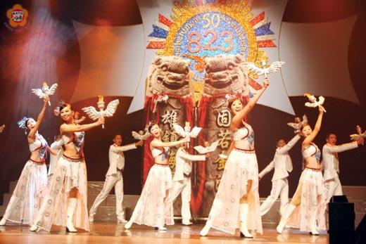 為紀念「八二三砲戰」勝利五十周年,國防部昨晚舉辦「八二三戰役」五十週年第二場紀念晚會,在藝工隊精心安排的大型歌舞表演,以及女子團體ING、郭靜、范瑋琪等知名藝人現場飆歌,現場千餘名軍民在聲光效果十足中,共度熱鬧又溫馨的紀念晚會,緬懷當年壯烈雋永的輝煌戰役。 「八二三戰役」五十週年紀念晚會於昨日晚間七時許在金門縣文化局演藝廳熱鬧登場,現場計有八二三戰役參戰官兵、遺族勵進會、防區官兵代表及民眾共計一千餘人,參加的人潮把演藝廳通道擠到爆滿,氣氛相當熱烈。 包括金門防衛指揮部指揮官陸小榮中將、國防部常務次長黃奕炳中將、國防部總政治作戰局副局長鄭瑞堅、金門縣長李炷烽夫婦、金防部政戰主任黃慶靈、中華民國八二三戰役戰友總會會長呂芳煙等人也都到場全程參與,與軍民聯歡。 陸小榮在致詞時表示,明天就是八二三砲戰五十週年,五十年前「八二三」戰役戰況慘烈,軍民秉持同島一命、軍民一家的精神,英勇作戰,使得中共未達成進犯金門企圖,才有今日的安定繁榮,他也特別對參戰的官兵與遺族代表致意,希望透過晚會的感念參戰軍民的付出,也希望大家「記取歷史教訓、珍惜兩岸和平」。 李炷烽則說,八二三砲戰對許多革命先烈與鄉親而言是一頁頁血淚歷史,希望兩岸共同記取「戰爭無情、和平無價」,盼大家告別歷史的陰霾、戰爭的苦痛,攜手同心,開創新坦途。 晚會在馬國萍、舒宗浩的主持下,藝工隊精心策劃「永遠的英雄」、「相聲脫口秀」、「福爾摩沙逗陣行」、「全民國防衛家邦」外,也邀請女子團體「ING」、知名歌手郭靜、楊培安、張秀卿、范瑋琪等登台演唱多首動聽的歌曲,由於台上演出者與台下軍民互動密切,讓現場氣氛HIGH到最高點。 「八二三戰役」五十週年紀念晚會,以「珍惜和平、追求雙贏」為主軸,營造「全民同心、支持國防」的活動氣氛,整體節目設計區分「光輝燦爛八二三」、「浯島采風慶太平」、「攜手同心創新局」等三個面向,展現金門文化兼容並蓄的特色,並呼籲「記取教訓、珍惜和平」,同時宣揚「全民國防」的理念。 為慰勉金門前線國軍官兵弟兄的辛勞及擴大紀念八二三戰役,明(二十四)日的第三場紀念晚會,將在金防部擎天廳舉行,表演節目除藝工隊精心策劃歌舞演出外,更有舒宗浩、林明與陳自為的相聲脫口秀表演,以及樂團演唱、國語熱門組曲、本土多元歌舞及特技表演等精彩節目,希望透過節目的演出,將榮耀光輝的八二三精神長存在國軍心中。