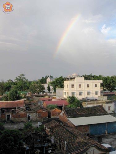 東方虹! 雨過天晴,夕陽西下,東虹當空,美感無價! 昨天傍晚,天現彩虹,先行發現的人趕快打手機傳遞美感,後收到者則奔相走告,希望讓美好的事物,分享給好朋友和好厝邊。