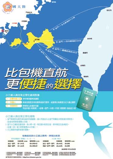 擴大小三通啟動一個多月,金門縣政府印製「比包機直航更便捷的選擇」海報,並分送各縣市政府、機場、車站、旅遊景點等張貼,期能帶來商機,並藉以傳達觀光旅遊資訊和申辦出入境手續事宜。 行政院於六月十九日通過並實施全面擴大小三通方案,由於部分旅外鄉僑還不明瞭相關辦法,金門縣政府也特別呼籲僑界金門鄉親或朋友,只要事先將相關簽證辦好,個人就可自由經金馬進出國境,省時省錢又方便,如果還有不清楚的地方,可逕洽移民署或金門縣政府交通旅遊局洽詢。