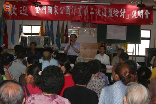 「金門國家公園計畫第二次通盤檢討」,昨日第二場太武山區說明會,上午在金湖鎮瓊林里辦公處舉辦,廣徵各界意見;立法委員陳福海、縣議員蔡水游及瓊林、小徑、埕下聚落居民到場聆聽,並提出建言,做為未來金門國家公園通檢計畫修正之參考。 金門國家公園計畫第二次通盤檢討委託國立金門技術學院江柏煒教授積極推動整體規劃案之檢討,並且完成期初簡報。金管處自日前起前進各聚落,將辦理八場次說明會。昨日是第二場說明會就來到金湖地區,廣徵各界意見,在金管處提出金門國家公園管一細部計畫、金門國家公園97-100中程計畫願景與目標報告後,與會居民也提出諸多建言。 金管處表示,第二次通盤檢討劃定原則與精神,除了秉持第一次通檢計畫劃定精神外,將針對下列各項重要原則進行通檢: 一、兼顧金門整體經濟發展需要(如金烈、金廈大橋及高職實習旅館、綜合體育館等預定地點之檢討); 二、兼顧生態保育與民眾發展權益; 三、合理土地分區使用及範圍現況檢討; 四、國家公園區域與鄰近特定區計畫之發展為原則; 五、凸顯傳統聚落及戰役紀念之特色; 六、振興地方產業推動生態旅遊; 七、發揮地方特色塑造金門國家公園生態與文化之多元形象等,為這次通盤檢討之重要原則。 「金門國家公園計畫第二次通盤檢討」各場次說明會,預定於珠山、瓊林、歐厝、山后、水頭、古崗、烈嶼、古寧頭等地舉辦,除了第一、二場外,其他場次辦理日期、時間及地點如下,金管處歡迎聚落居民暨關心地方發展之民眾參與說明會,提供意見做為未來金門國家公園計畫第二次通盤檢討之參考。 第三場古崗區(歐厝聚落):八月五日下午七時至九時,地點在歐厝宗祠。 第四場馬山區(山后聚落):八月六日下午七時至九時,地點在下堡宗祠。 第五場古崗區(水頭、謝厝聚落):八月十二日下午七時至九時,地點在水頭社區活動中心。 第六場古崗區(古崗聚落):八月十四日下午七時至九時,地點在古崗村辦公處。 第七場烈嶼區(湖井頭聚落;另邀上林、上庫、后頭、黃厝等聚落居民):八月十六日上午十時至十二時,地點在烈嶼鄉公所。 第八場古寧頭區(南山、北山、林厝聚落):八月二十一日下午七時至九時,地點在古寧村辦公處。