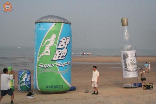 好大一瓶!此次海泳活動的民間最大贊助廠商維他露集團,不但現場大方贊助所有飲料,讓民眾「喝通海」,也特別精心準備數公尺高的「超大罐」金門高粱酒與舒跑氣球,顯眼的招牌,成為民眾拍照的特殊布景,相當有趣!
