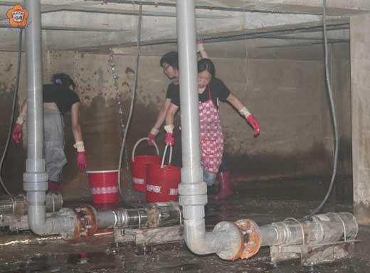 地表上,水舞沁人心;地表下,泥漿垢人身! 社福館每周播放影片前,廣場都會秀一段水舞。在夏天裡,水舞讓人覺得又清涼,又美麗。 最近,水舞設備正在進行維修,五、六名工作人員在地面下清泥漿、土垢、穢汙,工作十分辛苦。