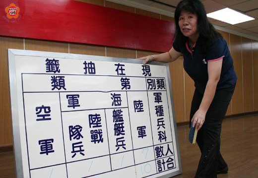 投袂荷戈! 又有人到了該振起衣袖,扛起武器,保國衛民的年齡。金沙鎮公所的承辦人員將役男的抽籤種類及人數公布在白板上。 金沙鎮公所昨天辦理九十七年度役男補抽籤。抽籤的結果如下: 海陸戰-黃和興。 海艦艇-張至淳。 陸軍-黃嘉宏、李冠緯、陳政保、張志源。