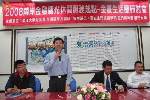 2008兩岸金融觀光服務起點─金廈生活圈研討會,昨日下午在金門技術學院舉行,一連三天在金門、廈門展開二場次座談會及十篇中英文學術論文發表,邀請兩岸學者專家各約十人次雙向交流座談,縣長李炷烽期盼集思廣益聽取各方意見,研議探討「金廈生活圈」的發展願景與具體施行方向。 這項由金門縣政府、淡江大學財金系、臺灣競爭力論壇主辦的「2008兩岸金融觀光服務起點─金廈生活圈研討會」,昨日下午一時起在國立金門技術學院國際會議廳舉行開幕式,由金門技術學院校長李金振主持,有金門縣長李炷烽及三十多位學者專家參加,就東方杜拜「金廈生活圈」願景探討,與會學者今(二十五)日並將小三通到廈門,與廈門大學學者就「兩岸金融經貿及三通進程」課題座談。 縣長李炷烽在金廈生活圈研討會中指出,要求大幅減少金門駐軍是一種手段,金門駐軍經過精實案部隊已減少很多,但軍管區域範圍還是很大,前省府主席顏忠誠對於撤軍也站在同意這邊,而撤軍也不會影響危害地區的安全性,反而會讓金門從軍事化走向國際化,國際化才是金門發展最有利目標,能夠緩和兩岸之間關係,作為兩岸交流便捷的橋樑。金門如果非軍事化,則許多重大決策不會受軍方的思維牽制。 李縣長也指出交通部民航局長說八個直航機場都準備好直航事宜,但是大家進出金門機場有看到改變嗎,尤其下午三點後台北就沒有飛航金門航班,讓人不可思議,金門在擴大小三通後造成金門的怨恨更深,因為金門鄉親對機票是一票難求,對金門是更不方便,這難道是「馬上就好」,「馬上就準備好」。所以一領導者經常跟事實脫節,它的判斷與承諾和事實有落差。 李縣長也指出給政策比給什麼計畫要好,對於大家來參與、關心,李縣長也表達謝意,對於台灣競爭力論壇上次在金門舉行,對金門意見表達出聲音認為很好,指示範圍太大太廣,在步驟上執行較緩慢,不如從自由貿易港區做起,前立委吳成典過去在立法院就有提案自由貿易港區,所以金門的前途不在台灣,台灣可以給我們最好條件,然過去金門所付出的代價得到今天的結果,所以在新政府的方針政策下,我們應調整自己的思維,改變自己的腳步。李縣長也表示,金門是中華民國一部份,金門的好壞是台灣的成就,應該有整體的感覺。他也舉例九十三年金酒公司發生重大火災事件,損失很大,但是國稅局等單位都沒有派人來關心,但是抽稅卻照常讓人不敢苟同。