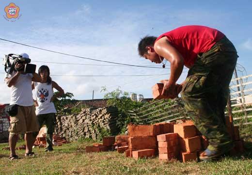 台灣尚青,金門尚紅! 金門最紅、最夯的社區是那裡?新前墩可以說當仁不讓! 第六屆新前墩文化節將於六月二十八日登場,為期四天。在社區營造即將進入沸點的時候,三立電視台「台灣尚青」節目製作團隊及主持人阿嬌,昨天走訪了新前墩,並拍攝新前墩的紅泥土角窯。 新前墩的焢窯已有三代。第一代是純土窯,第二代是土角窯-圖中正在製作的即是;「台灣尚青」稱它為鋼盔窯(因為形狀很像)。 如今,新前墩結合兩種土窯的優點,已有了第三代紅土窯的研發。