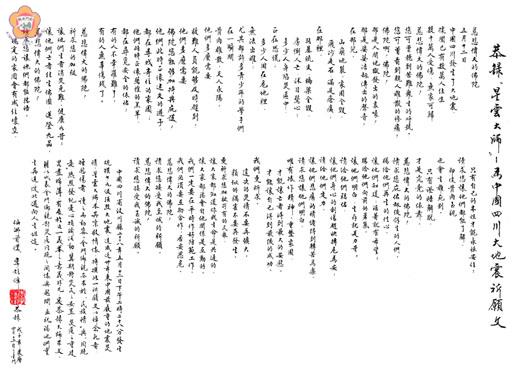中國大陸四川省汶川縣五月十二日下午二時二十八分發生規模八級強烈大地震,造成近三十年來中國最嚴重的地震災情。金門縣政府除設立賑災專戶,發起樂捐活動,縣長李炷烽、副縣長楊忠全也拋磚引玉,分別捐出新台幣十萬元、三萬元,李炷烽也親自揮毫,恭錄星雲大師─為中國四川大地震祈願文,表達關懷慰問。 金門縣政府基於民胞物與的情懷,於「台灣土地銀行金門分行」開立專戶,戶名「金門縣政府四川大地震賑災專戶」,帳號:039001029308,接受各界捐款,期盼結合縣民力量,加入賑災行列,匯集全島最大愛心,全力奧援災區。 縣長李炷烽、副縣長楊忠全特別拋磚引玉,分別捐出新台幣十萬元、三萬元,李炷烽也呼籲全體縣民發揮人飢己飢,人溺己溺的「民族情、同胞愛」精神,踴躍捐輸,為救災活動盡一份心力。 李炷烽也親自揮毫,恭錄星雲大師─為中國四川大地震祈願文,以代表金門鄉親表達對大陸災區同胞的關懷與慰問之意。祈願文內容如左: