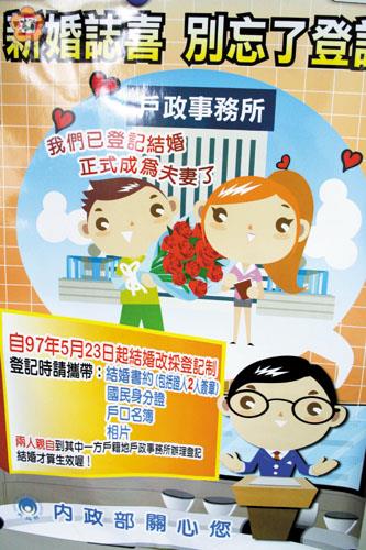 要在今年五月二十三日以後結婚的新人,結婚須向戶政事務所登記才生效。這項新變革,內政部並已請各縣市加強宣導中。 內政部新修訂條文已將過去「應有公開儀式」刪除,將儀式婚改為登記制,自九十七年五月二十三日起,結婚雙方當事人必須到戶政單位辦理結婚登記,才有合法的婚姻效力。 內政部經於去年五月四日修法通過,將現行的儀式婚改採登記制,將民法第九百八十二條原條文內容「結婚,應有公開儀式及二人以上之證人」,修正為「結婚應以書面為之,有二人以上證人簽名,並應由雙方當事人向戶政機關為結婚之登記,始生效力。」。也就是說,過去傳統結婚喜宴的婚禮儀式可有可無,但是結婚的戶籍登記卻不可不辦,因為有去戶政單位辦理結婚登記,才有合法的婚姻效力。 因此,要在今年五月二十三日以後結婚的新人,可改變以往的婚禮儀式,可先利用上班日挑選好良辰吉日,到戶政事務所辦理結婚登記,再利用假日辦理婚禮宴客,同時兼顧法律與傳統習俗。 由於自今年五月二十三日起,結婚須向戶政事務所登記才生效,影響民眾權益甚鉅;在結婚雙方當事人在國內、外結婚,以及有否國內戶籍,應備文件規範各有不同。對此,內政部已訂定「戶政事務所辦理結婚登記作業規定」,民眾可先洽詢,了解權利義務事項。 根據內政部戶政司表示,結婚當事人在國內結婚者,應向戶政事務所辦理結婚登記,結婚才生效力,結婚生效日期即為結婚登記日期;「當事人如在國外結婚,且依涉外民事法律適用法第十一條規定已生效者,結婚生效日不以向戶政事務所辦理結婚登記日為準」。 民法親屬編第九八二條規定,結婚應以書面為之,有二人以上證人之簽名,並應由雙方當事人向戶政機關為結婚之登記。戶政司表示,五月二十三日起辦理結婚登記者,應由「結婚雙方當事人」申請。五月二十二日以前結婚或其結婚已生效者的結婚登記,得由結婚當事人之一方申請登記;另外,「未成年人結婚者,戶政事務所應查驗法定代理人同意書」。 戶政司並指出,結婚登記分為國內結婚與國外結婚兩大態樣;國內結婚又依雙方當事人是否有國內戶籍而有不同規定,若是當事人雙方或其中有一人在國內現在有戶籍或曾經有戶籍,可向現戶籍地或最後遷出戶籍地的戶政事務所辦理結婚登記。如果雙方當事人在國內未曾設戶籍,在國內結婚,這種結婚登記「得向任一戶政事務所為之」。 在國外結婚部分,如果當事人雙方或其中有一人在國內現在有戶籍或曾經有戶籍,可以檢具相關文件向駐外館處、在港澳的中華旅行社及海峽交流基金會申請,經驗證後函轉或授權委託他人到戶籍地或最後遷出戶籍地的戶政事務所辦理結婚登記。如果雙方當事人在國內未曾設戶籍,戶政司指出,在國外結婚,這種結婚登記也須經駐外館處、在港澳的中華旅行社及海基會驗證後,函轉「中央主管機關指定的中央政府所在地戶政事務所」辦理。 至於應該準備的身分證明文件,當事人若是在國內現在有戶籍,戶政事務所將查驗國民身分證、印章、戶口名簿、最近一年內所拍的正面半身彩色相片。當事人如果是在國內曾有或未曾設戶籍,戶政事務所則將查驗護照或移民署核發的居留證明文件。 戶政司表示,結婚證明文件也是必備的查驗文件,若為國內結婚須準備「結婚書約」;如果是國外已經生效的結婚,則須查驗駐外館處、港澳的中華旅行社及海基會驗證過的「結婚證明」或已向當地政府辦妥結婚登記(或結婚註冊)的證明文件及中文譯本,並須加蓋「符合行為地法」的戳章。 若結婚當事人其中一人是外國籍,戶政事務所將查驗外籍配偶取用中文姓名聲明書、經駐外館處驗證的婚姻狀況證明文件及中文譯本。而與中國大陸人民辦理結婚登記時,戶政司指出,戶政事務所將查驗結婚證明文件,以及移民署所發加蓋了「通過面談,請憑辦理結婚登記」戳章的台灣地區入出國許可證;在中國大陸或港澳作成的文書,應經中華旅行社或海基會驗證。 而內政部為了便利民眾申辦結婚登記,已訂定「戶政事務所辦理結婚登記作業規定」,民眾可以向戶政事務所洽詢應該注意事項與準備文件。