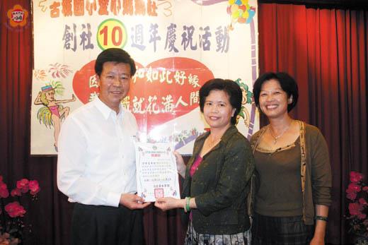 古城國小愛心媽媽社昨日舉行創社十週年慶暨母親節親師生一家親活動,縣長李炷烽親自參與活動,稱許該社愛心媽媽的無私奉獻精神,用愛心滋潤溫暖了子弟,是地區社團和社區發展協會組織的模範。李縣長也頒獎表揚該社績優導護志工和幹部,並恭喜許華玉議員、和周手治連任該社社長、副社長。 母親節將屆,古城國小愛心媽媽社結合學校師生以實際的淨灘行動,到水頭茅山塔海域舉行「世界地球日淨灘活動」,來讓創社十週年慶活動更有意義性,也舉辦一場親職講座,透由專家的分享親職專業經驗,來過一個有親職教育性的母親節。 晚間也舉行聯誼活動,縣長李炷烽在縣府教育局長李再杭、機要秘書許加發的陪同下參與活動,金酒公司董事長雷倩、總經理王毅民、以及縣府財政局長黃景舜、金城鎮長蔡輝詩、鎮代會主席陳天成等來賓也到場表達道賀之意,受到古城國小校長吳水澤、教師以及古城國小愛心媽媽社社長許華玉、副社長周手治和愛心媽媽的歡迎。 李縣長頒獎表揚該社績優導護志工和幹部,許華玉、許秀寶、李雪珍、楊麗娟、方齡慧、呂佩珊、陳玉黎、何月玲、蔡碧玲、許麗珠、黃金玉、陳華、蔡碧華、蔡碧治、周手治、陳美蓮、翁彩華、唐寶華、邵福治、石明輝、李寶珠,稱許他們熱心的服務表現。 許華玉感謝夥伴們的熱心參與和犧牲奉獻,才能讓該社走過十個年頭,當初讀小學的孩子已經在接受高中職教育,孩子的健康成長,就是所有愛心媽媽最好的報酬。 她也說,該社目前有四十二位成員,僅有十四位媽媽的子女還在就讀古城,大部分媽媽的子女已經在接受國中以上的各階段教育,還有的媽媽已升格阿嬤級,但是十年來仍然為這個學校出錢又出力,利用閒暇參與學校教育活動,並全力投入愛心導護工作,十年來全年無休,為學生提供安全的學習環境。 許華玉也建議縣府教育局適當的編些預算經費,來為各學校的愛心媽媽社打氣。