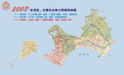 由金門縣政府主辦的2008「金酒盃」全國自由車公開賽,將於今(四)日鳴槍開賽,此次共有七百四十七名選手參加競賽組和休閒組活動,一起環島飆鐵馬、拚獎金。 金門縣體育場表示,首度舉辦的「金酒盃」全國自由車公開賽,競賽組計有二十二支車隊、一百三十七人報名參賽,休閒組有六百一十人報名。 昨日下午一時至五時進行競賽組報到,競賽組選手陸續前往縣立體育場報到領取物品、車檢 ;下午五時至六時則進行競賽說明。 據了解,此次女子組僅有八人參賽,未達二十人次的參賽人數規定,所以獎金縮小減半,第一名將從獎金六千元,減成三千元,所幸取六名,獲獎的機率還蠻高的。 2008「金酒盃」全國自由車公開賽今年雖是第一屆,但是有不少國內自行車好手參賽,這些高手的裝備也是不凡,據了解他們所騎乘的自行車一般平均要價都要二十幾萬,有的甚至要價五、六十萬,比一輛小客車還貴,令人聞之不覺吒舌。 體育場表示,不讓台籍好手專美於前,今年地區也有不少的鐵騎好手報名參賽,例如金門鐵人三項運動委員會總幹事蔣光明、陳孝瑜等人,此外,包括金門縣刑警隊隊長蕭欽杰、副隊長李智源也組一支五人小組「疾風勁旅之XT戰警」隊參賽,總計地區也自組七、八隊車隊參賽,共襄盛舉。 這項比賽,將於今日上午八時在環島北路仁愛新村圓環分三梯次鳴槍開賽,其中,男子菁英組賽程為一百一十一公里,男子分齡組和女子組為七十四公里,休閒組為十二公里。 金門縣體育場表示,四日上午活動期間,競賽路線是從仁愛新村圓環出發、經經環島北路、環島東路、溪邊、西村折返出發點,競賽期間實施交通管制,希望民眾能配合,以維護參賽選手的安全。