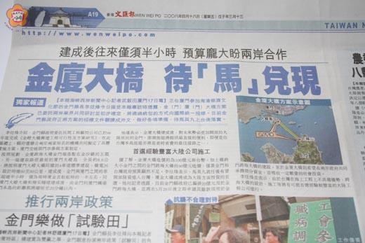 日前前往大陸廈門參加海滄慈濟文化節的金門縣長李炷烽,在接受香港文匯報專訪時透露,金嶝(廈)大橋方案已委託兩岸業界共同研討並初步確定,將通過統包的方式向國際統一招標。而目前金門縣政府正將方案的招標文件翻譯成外文,做好各項準備,期待新政府總統馬英九上台後能「馬上」落實。 李炷烽也向文匯報記者表示,「金廈特區」構建實為雙贏之舉,金門願意扮演兩岸政策「試驗田」的角色,無論是金融、教育、旅遊等各項政策,都可以在金門試行後再加以推廣。 香港文匯報在四月十八日於A19版,以近半版的篇幅,針對「金嶝(廈)大橋」、「金廈特區」等議題,專訪了金門縣長李炷烽。 李炷烽向文匯報記者介紹指出,金門縣政府委託民間工程顧問公司已於2006年底完成「金嶝(廈)大橋興建工程可行性及方案研究」,在此基礎上,金門縣政府還聯合兩岸兩家知名的機構共同擬定了具體實施方案,而廈門交通部門亦參與方案制定。 而按照規劃,金嶝(廈)跨海大橋金門端落點在金沙鎮的五龍山,另一端選取路徑最短的廈門大嶝島,全長約八點六公里,將按照廈門大嶝大橋同樣的四車道標準建設,橋寬二十六米,設計時速六十至八十公里。建成後,金門與廈門之間的車程不超過半小時,僅為現時金廈直航航時的一半左右。同時,廈門大嶝大橋和翔安隧道建成後,由金門到廈門機場和廈門本島的距離都將縮短至二十分鐘以內。 李炷烽也表示,金廈大橋建成後,對未來勢必更加開放的大陸居民到金門、澎湖旅遊將提供最直接的便利,即便是往台灣本島旅遊亦將是省時省費的最佳線路之一。 文匯報在專訪中提及,據了解,金廈大橋造價約為一百億元新台幣,加上橫跨大小金門之間的金門跨海大橋的四十億元造價,僅靠金門和台灣政府預算顯然不足。李炷烽表示,馬英九就任後有望開放陸資進入台灣,金廈大橋或將成為大陸方面投資的首選。他也向記者透露,目前金門縣政府已編列二十億元用於金門跨海大橋,並將在五月二十日後,立即申請其餘款項用於金門跨海大橋的建設。至於金廈大橋則希望由兩岸政府共同承擔部分資金,並吸收一定數量的社會投資。 李炷烽並表示,由於台灣在海上工程上不具備優勢,跨海大橋的設計、施工等將有可能首選經驗較豐富的大陸工程公司進行。 有關「金廈特區」構建的議題,李炷烽則表示,他任內一直在積極推動兩岸共建「金廈特區」,但無奈民進黨執政期間兩岸政策如同「吝嗇鬼切香腸」,這一構想實踐起來舉步維艱。 他並表示,金門和廈門其實都是兩岸政府「一國兩制」下特別行政區,希望兩「門」共建特區,能真正為金廈共創商機。李炷烽表示,儘管「小三通」已開放八年,但金門所受「中轉效益」其實相當有限。金門要發展,必定是在兩岸全面三通以後。 香港文匯報在報導中也提及,依據該報獲悉,福建省擬新增開通廈門五通客運碼頭至金門的航線。 此外,李炷烽也向文匯報記者透露,金門酒廠正與中國免稅品中心香港分公司商談,在香港代理銷售金酒事宜,預料年內金酒就能批量進入香港市場。而此前媒體有傳金酒將在大陸投資裝罐生產線,李炷烽說要投資生產線必須量上達到一定規模,還要待時機成熟。