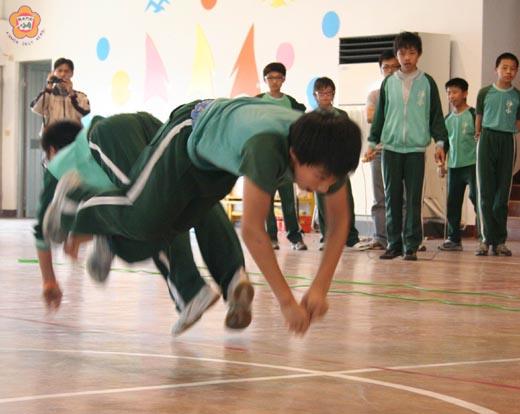 「韃韃」聲中跳跳跳,有形線變無形罩;一條跳繩百迴旋,跳掉褲子君莫笑!金沙國小昨天舉辦九十六學年度跳繩比賽;有一個小男生跳到褲子快要落下了,還是提了褲腰再跳;再跳再掉,又提又跳::。雖然引起旁邊的同學發笑,卻認真地完成了比賽。 為了推廣民俗體育,提倡運動風氣,促進學生身心健康,金沙國小昨天舉辦全校跳繩比賽。在跳繩落地的韃韃聲中,小朋友跳跳蹦蹦,跳出健康和活力。校長楊肅正表示,這項體育很適合課間進行;學生黃念慈、李孟霖、鍾雪茹等表示,跳繩很累,但跳一跳,心情變好,身體也更健康。 比賽分組依低年組、中年組、高年組再分團體賽及個人賽。團體獎:取前三名給獎;個人賽取前六名給獎。 除了跳繩比賽之外,由教師彭康順所指導的「繽紛」花式跳繩隊也在比賽中串場表演;參演的學生有徐微婷、王若盈、黃和崑、何育瑞、張博昇、黃舒郁等。 根據彭康順的解說,沙小的團體花式跳繩有三角跳、十字跳、波浪跳、五人二繩跳、伏地挺身跳;雙人組的花樣有二人一繩、二人二繩;單人表演則有對摺跳、斜一邊跳等。 其中,伏地挺身跳是由張博昇演出,他配合著繩起繩落,彈起四肢,做出伏地挺身。五人二繩則是由三人共跳一條短繩,短繩中的三人組同時又跳著長繩;三人組的兩旁各有一人隨著長繩的頻率跳躍。 彭康順表示,跳繩可以訓練心肺耐力及手腳協調,但單腳跳繩或雙腳平跳過於單調,花式跳繩配合音樂進行,就會變得有趣多了。