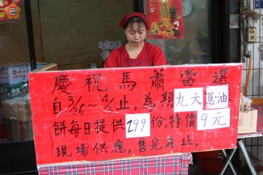 慶祝馬蕭當選,金城地區一家蔥油餅店特以較低的價格優惠消費者,連日來生意是好的不得了,雖然利潤減少,不過,陳姓老闆娘說,只要大家高興就好! 馬英九與蕭萬長以高票當選第十二任總統、副總統,在金門的鐵票區更囊括百分之九十五的得票率,位於金城市區貞節牌坊旁的一家蔥油餅店就打著慶祝馬蕭當選正副總統,自三月二十六日至四月三日為期九天,蔥油餅每日供應二百九十九份,特價九元,現場供應,售完為止,連日來吸引不少消費者前往購買。 陳姓老闆娘說,她是看台灣的新聞,有的店家為了慶祝馬蕭總統選舉大勝,水餃店推出前十顆水餃不用錢等的報導,而且馬蕭在金門得到百分之九十五的選票,她很開心,也希望回饋一下顧客。 這位家住何厝的陳姓老闆娘指出,推出這項優惠價後,消費者中大約增加了三分之一的新面孔,而三分之二是老客戶,而原來十五元的蔥油餅降到九元,而二十元的蔥油餅加蛋也由二十元降到十五元。她說,三月二十六日推出後,原本每天優惠一百九十九個,但供不應求,決定增加為每天二百九十九個,這幾天來每日賣出的數量大約比平日增加了將近一倍。 由於生意好,陳姓老闆娘每天從凌晨二時就開始準備材料,早上六點開市一直到下午五、六點才休息。